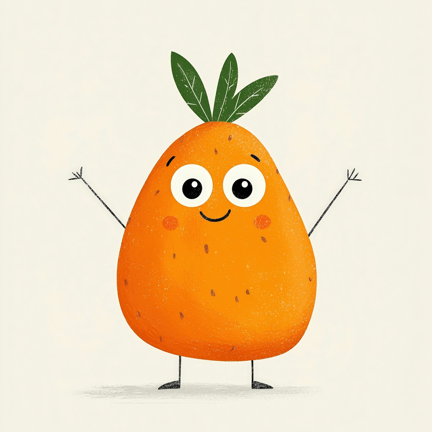 Cute cartoon orange potato character with big eyes, green leaves, and a friendly smile on a light beige background.