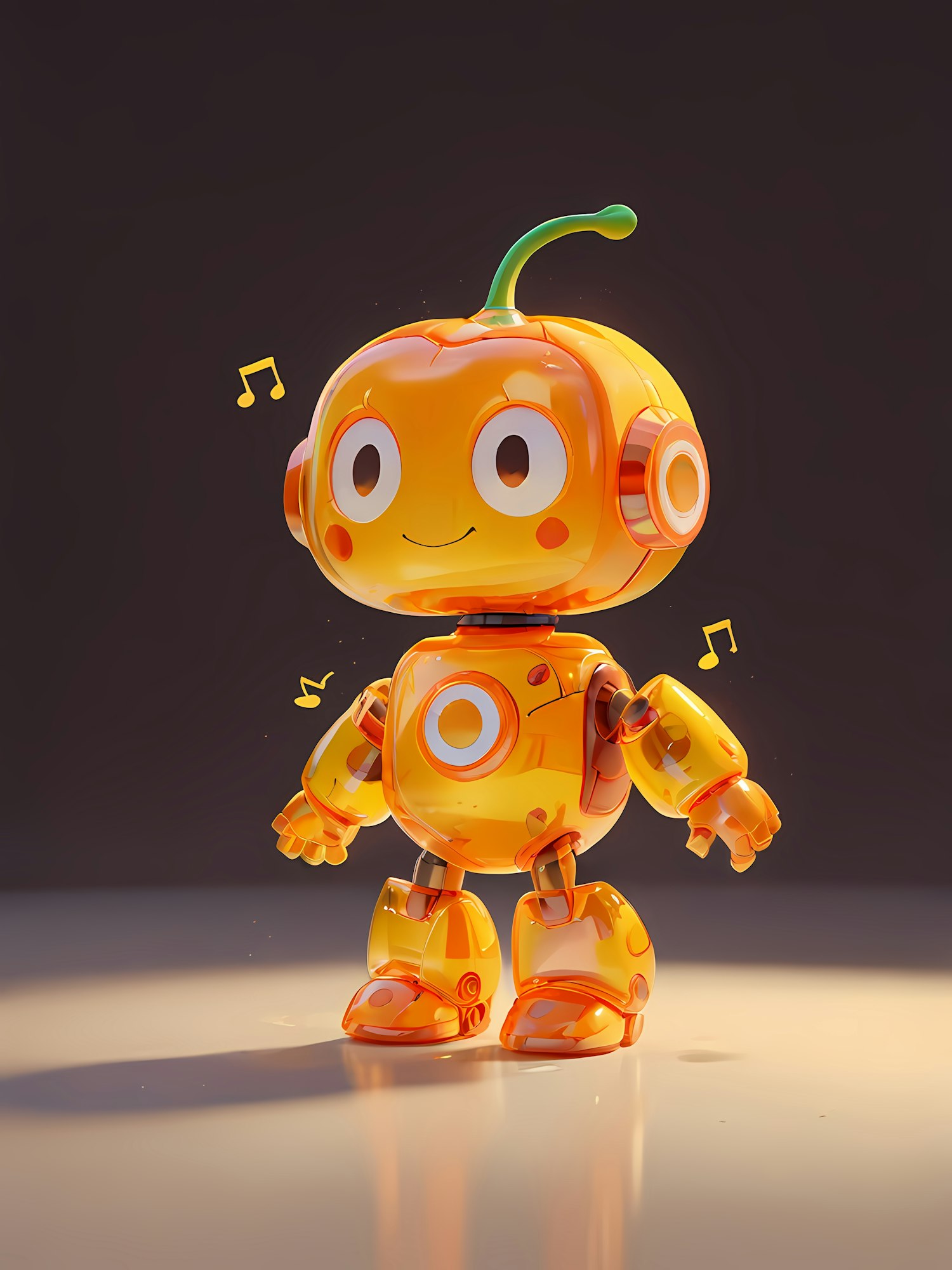 Adorable orange robot with a pumpkin-like design, green antenna, and musical notes floating around, set against a dark background.
