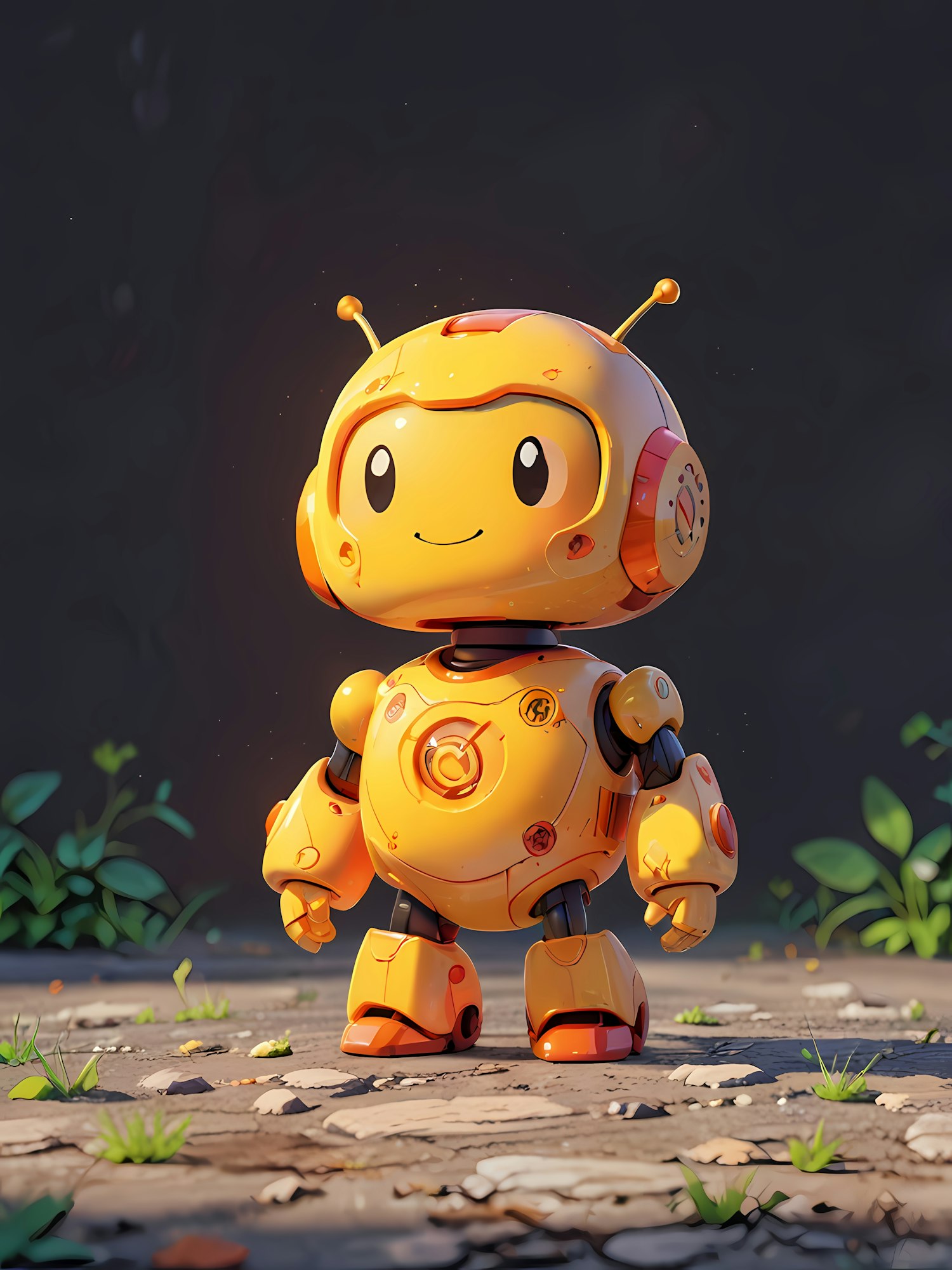 Adorable yellow-orange robot with a cheerful smile, standing on a cracked stone surface surrounded by greenery. Whimsical and vibrant design.