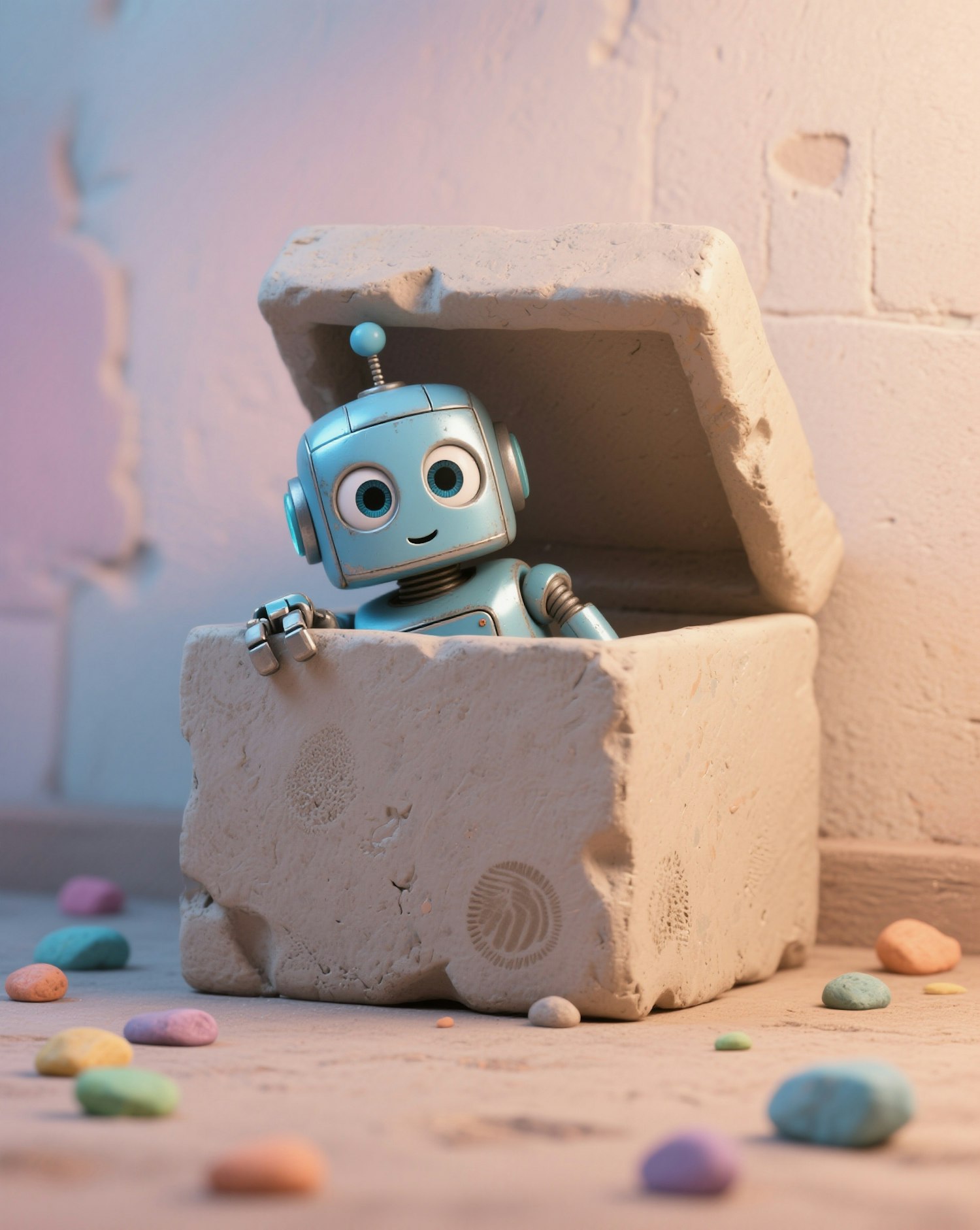 A cute blue robot peeks out of a textured stone box, surrounded by colorful pebbles in a warmly lit setting.