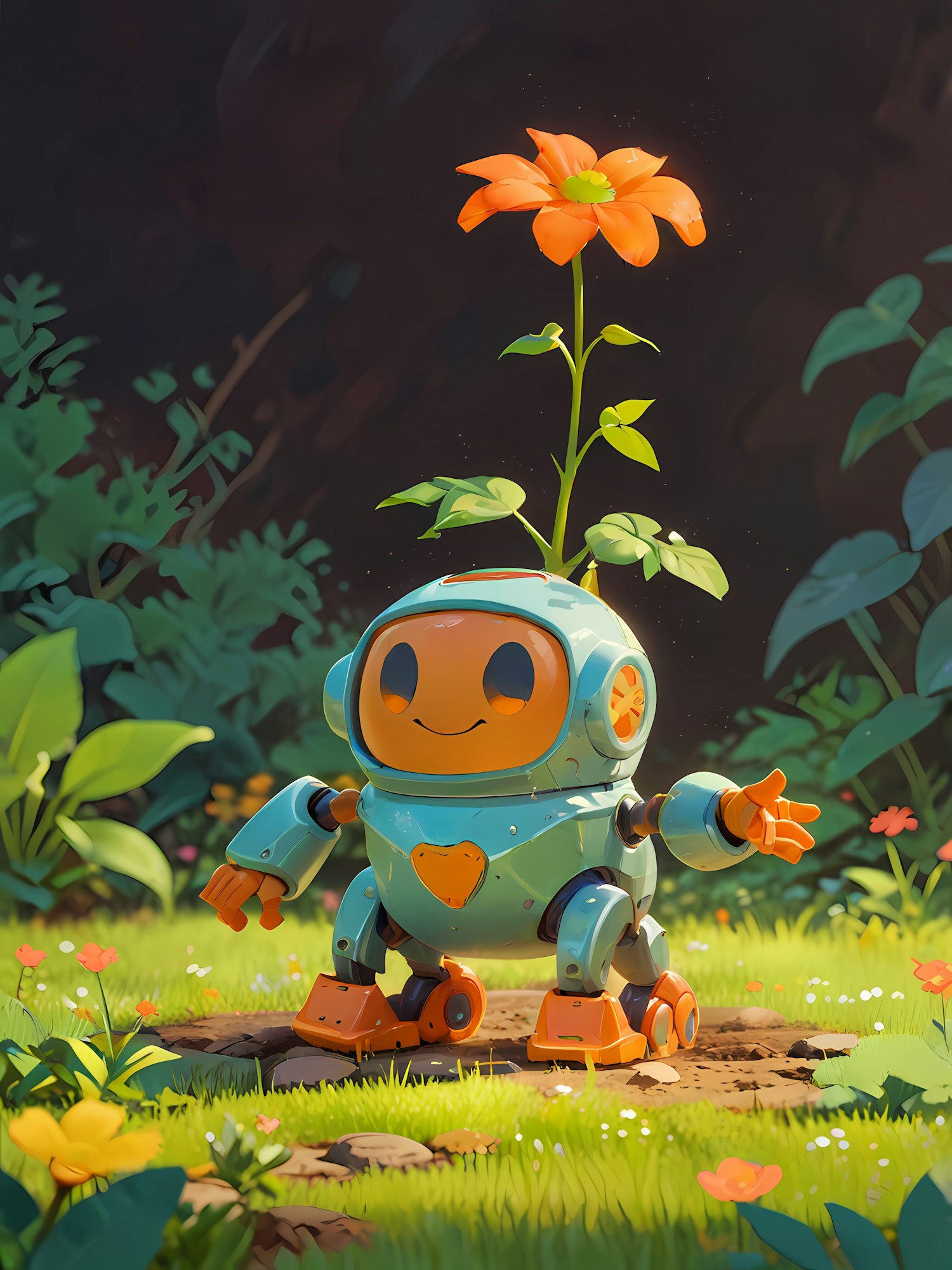 Adorable robot with a flower on its head in a sunny meadow, surrounded by vibrant greenery and colorful wildflowers.