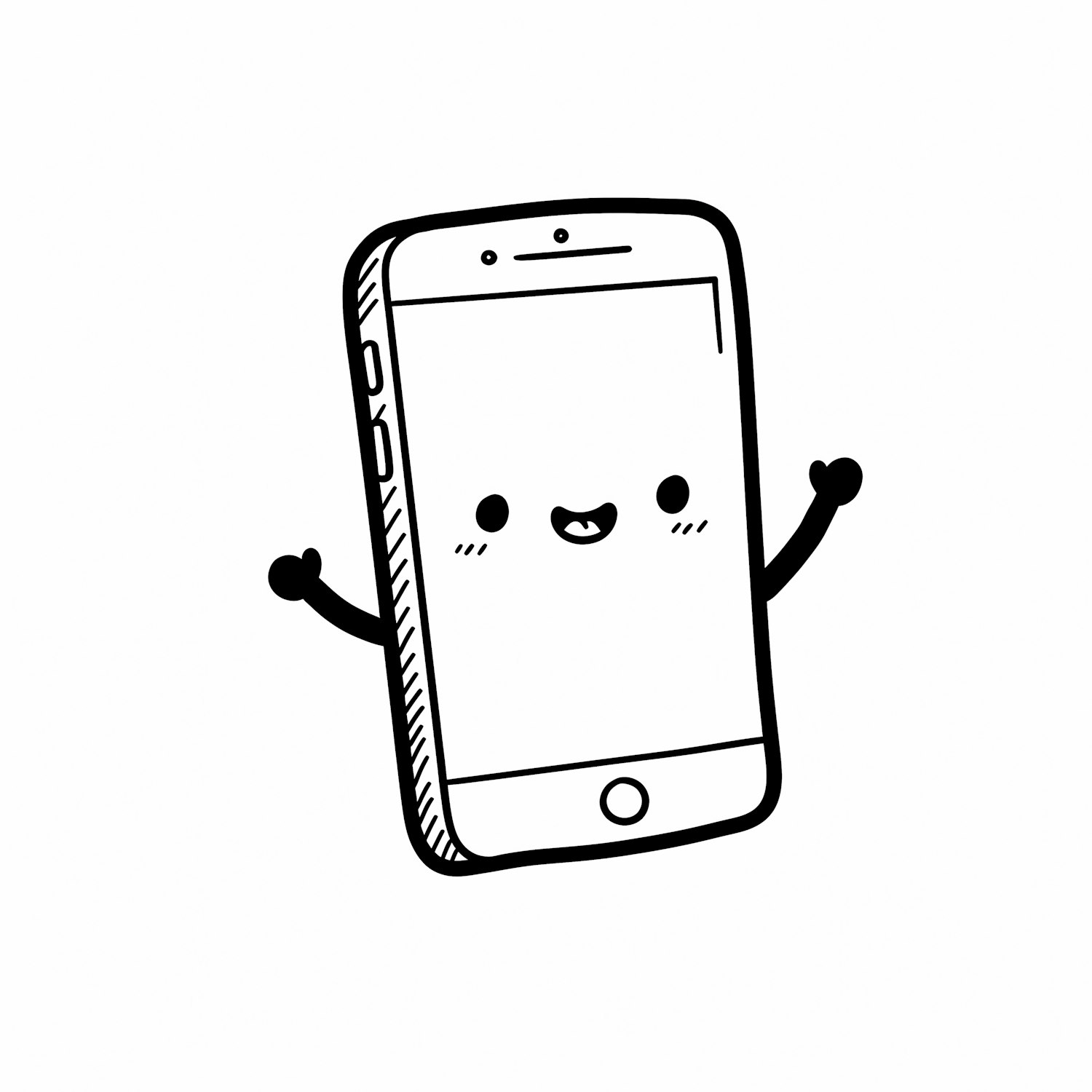 A cute black-and-white illustration of a smartphone with a happy face and raised arms, perfect for tech or communication themes.