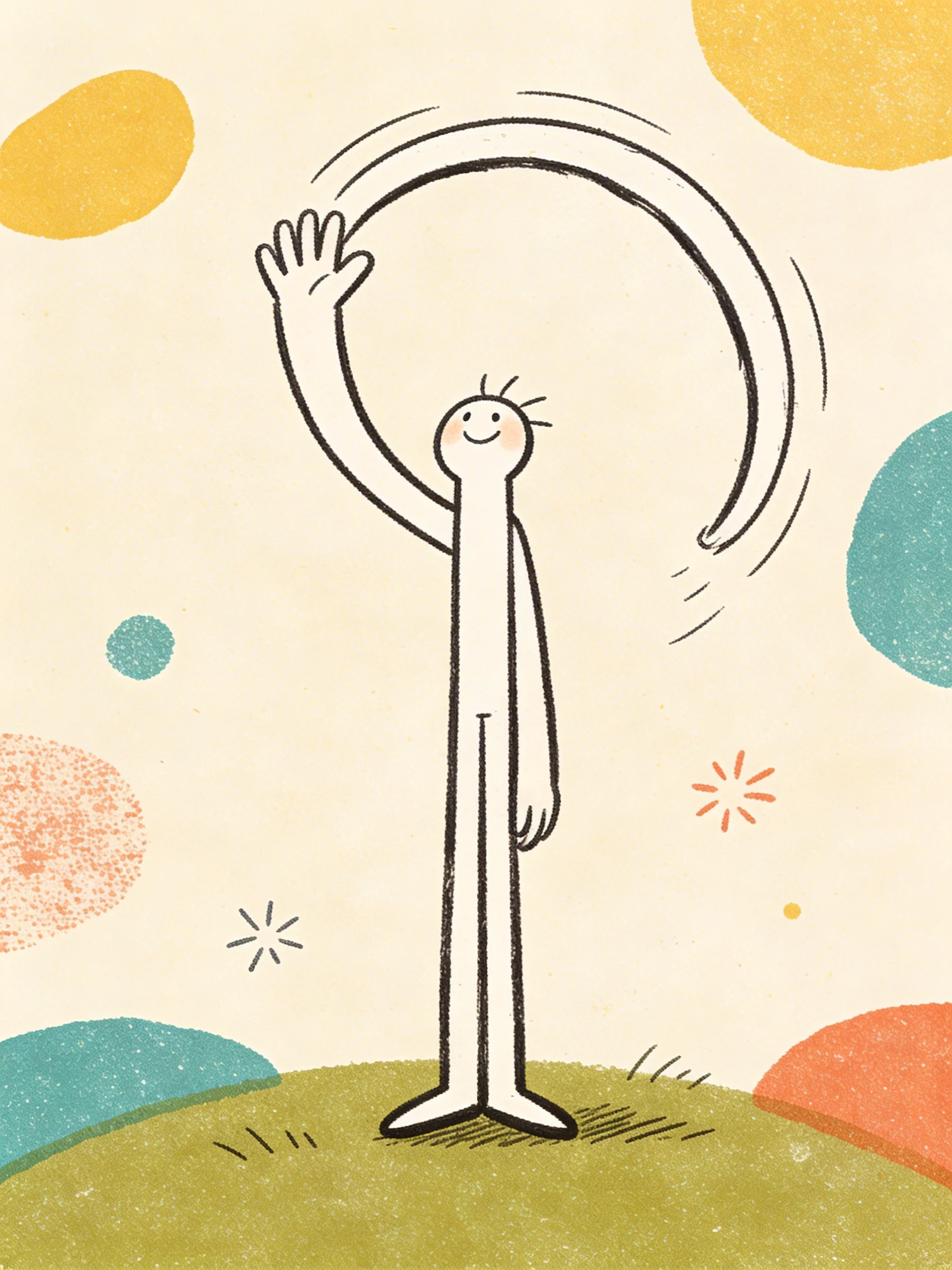 A cheerful stick figure waves on a grassy hill, surrounded by colorful shapes in a playful, minimalistic illustration.