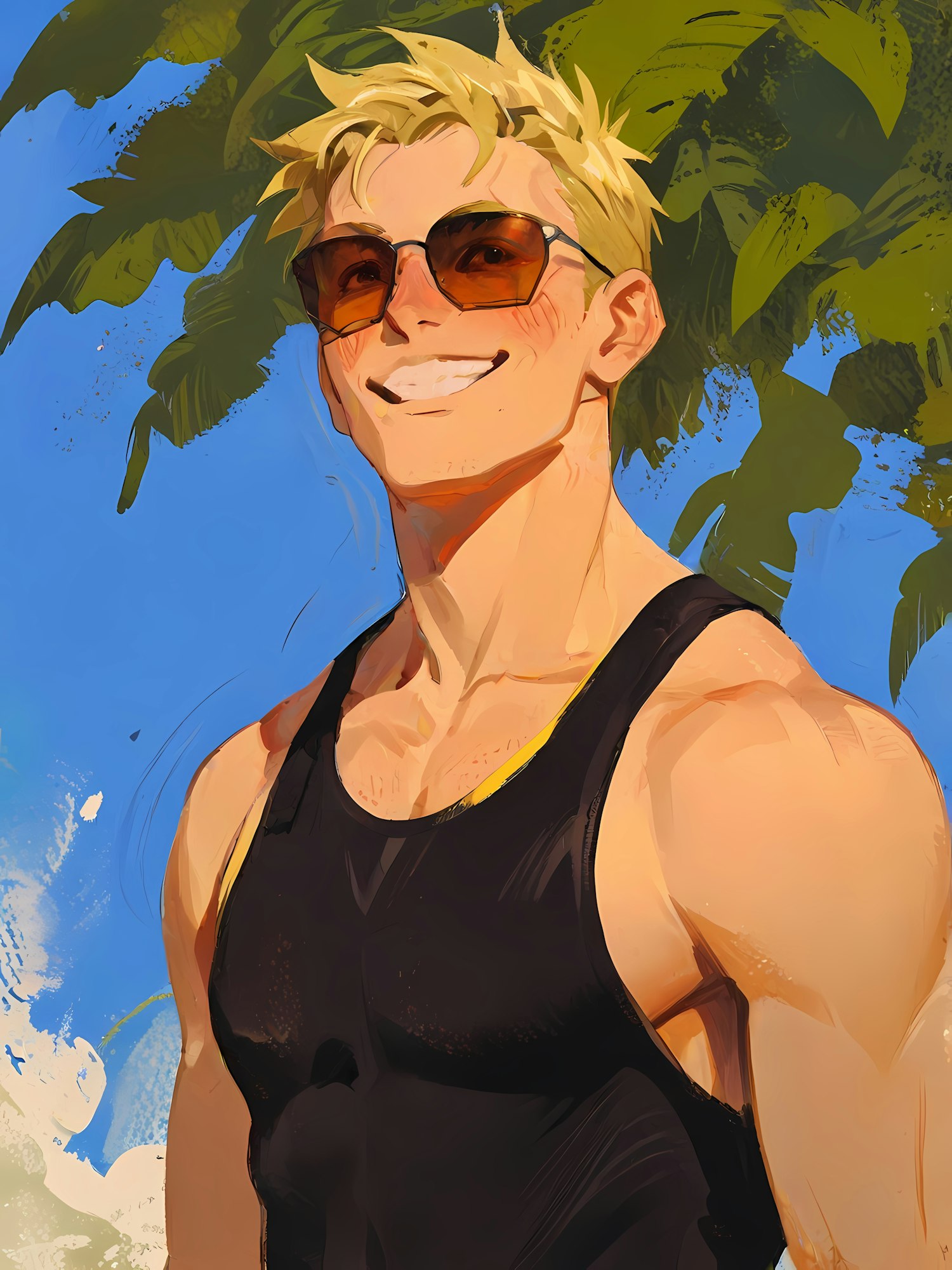 Bright illustration of a young man in a black tank top, wearing sunglasses, smiling against a sunny backdrop of blue sky and green leaves.