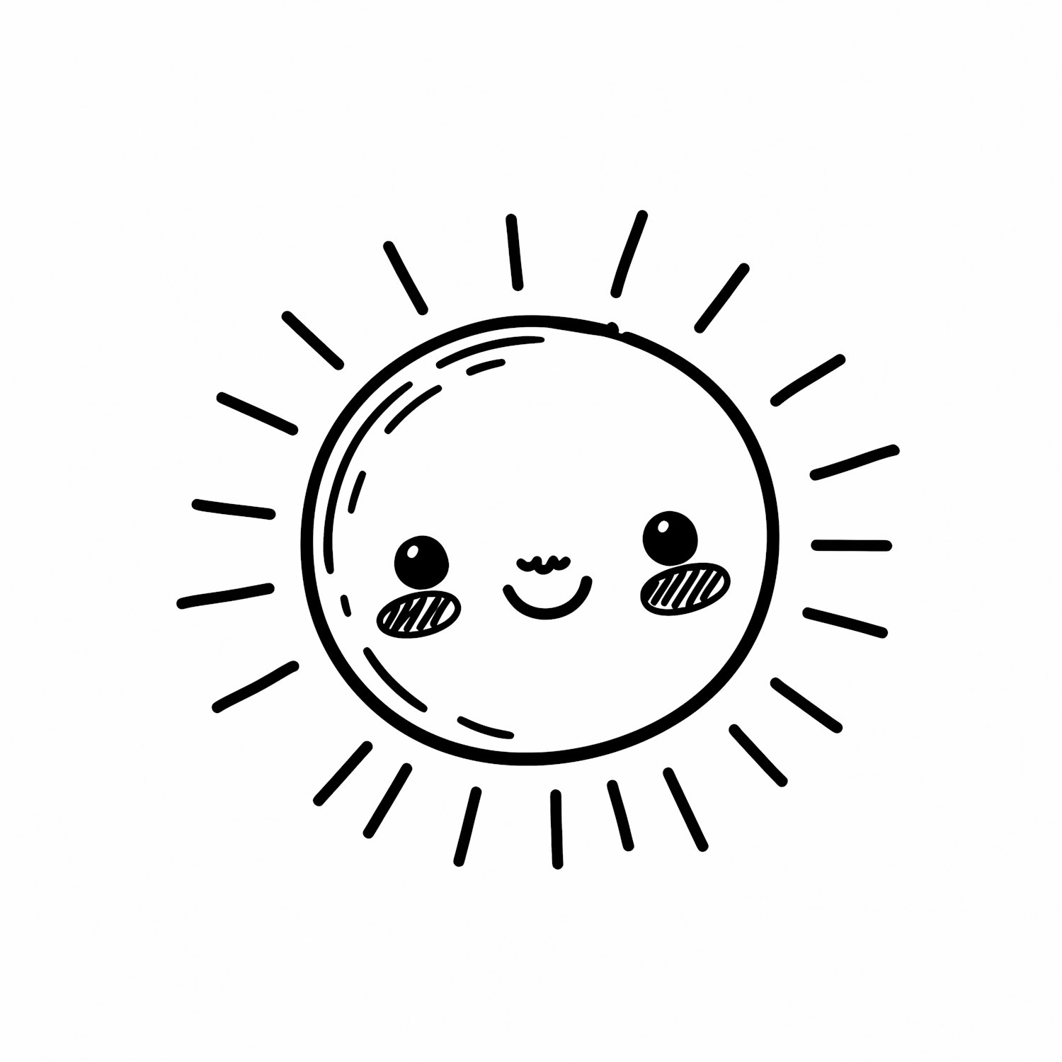 Cute black-and-white illustration of a smiling sun with radiating lines, perfect for cheerful and playful designs.