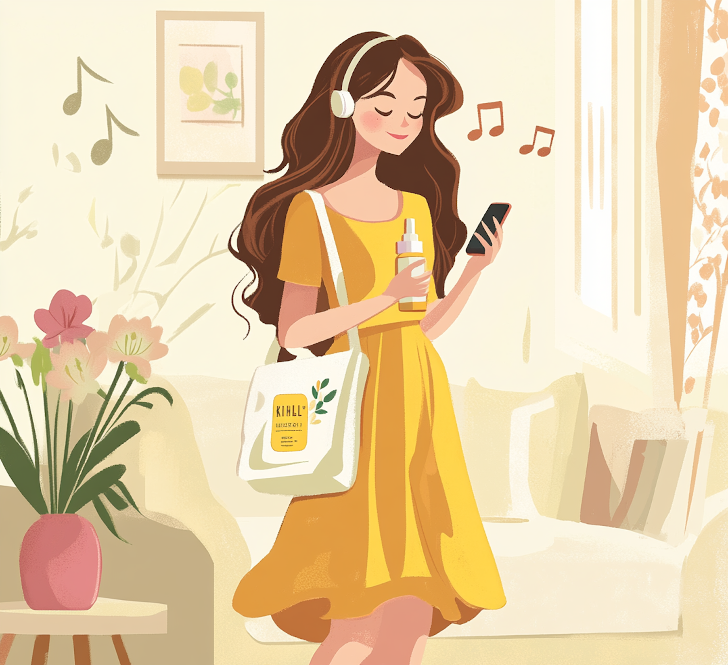 Illustration of a woman in a yellow dress enjoying music with headphones, holding a phone and spray bottle, in a cozy room.