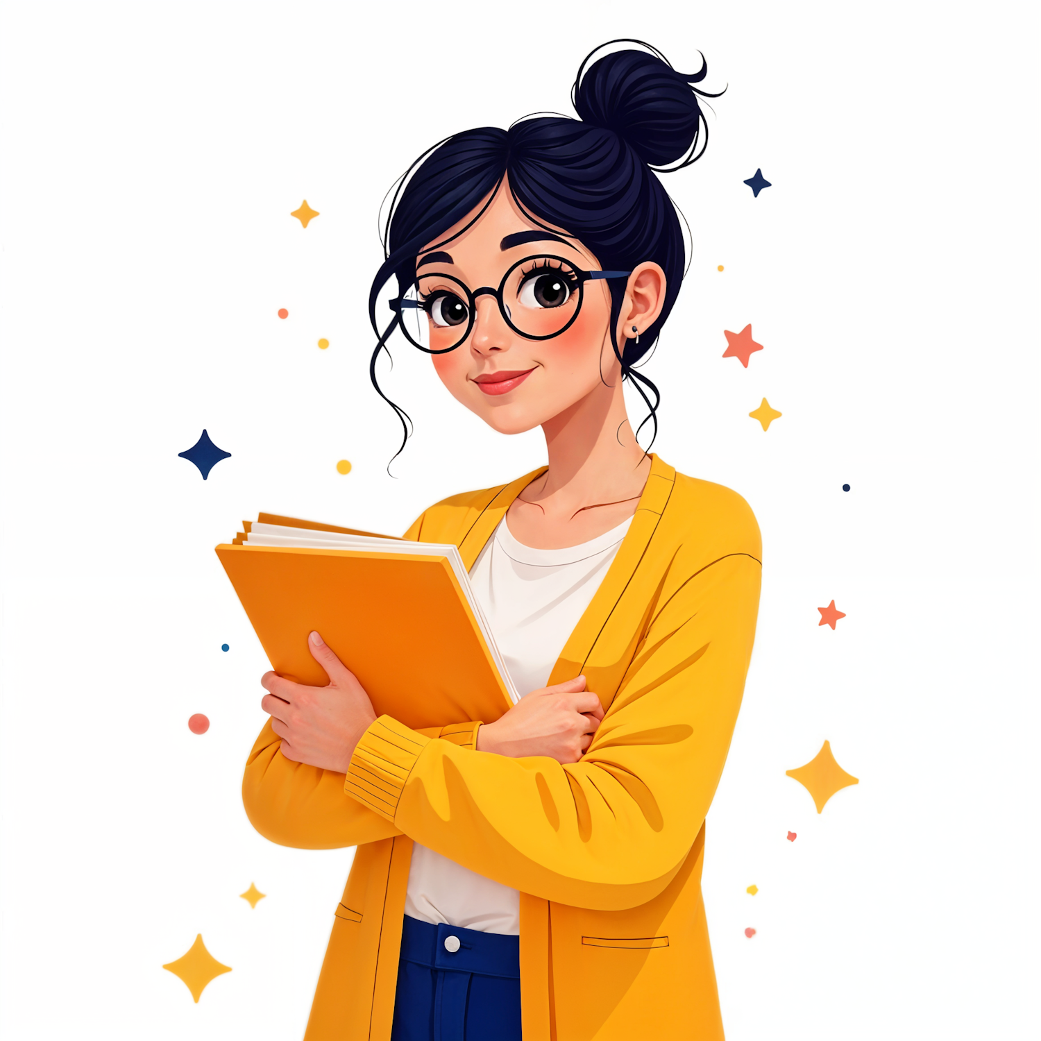 Illustration of a young woman with glasses, holding a yellow folder, wearing a yellow cardigan. Playful star patterns in the background.