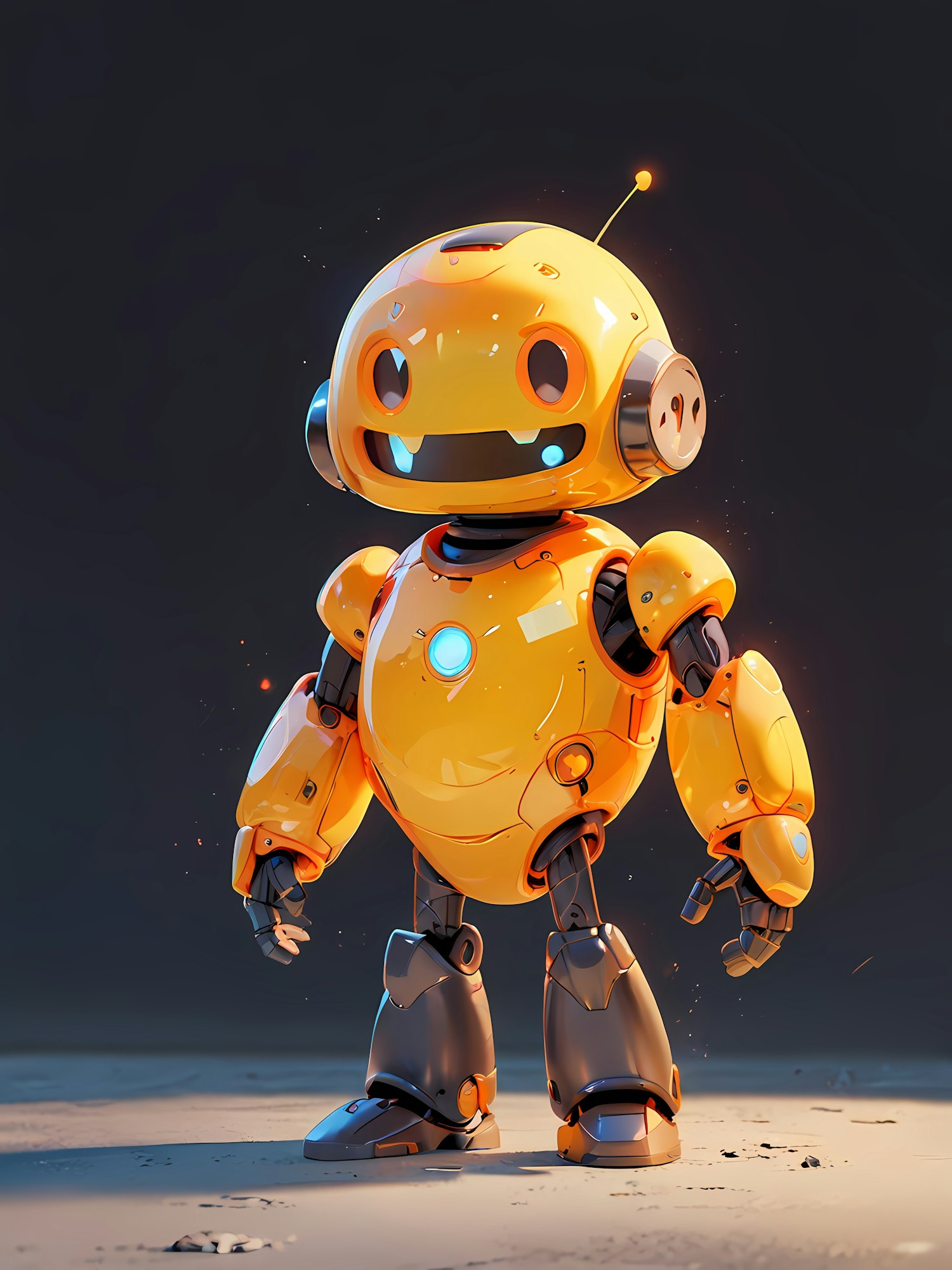 Adorable yellow robot with glowing blue chest light and expressive eyes, standing on a dusty surface against a dark background.