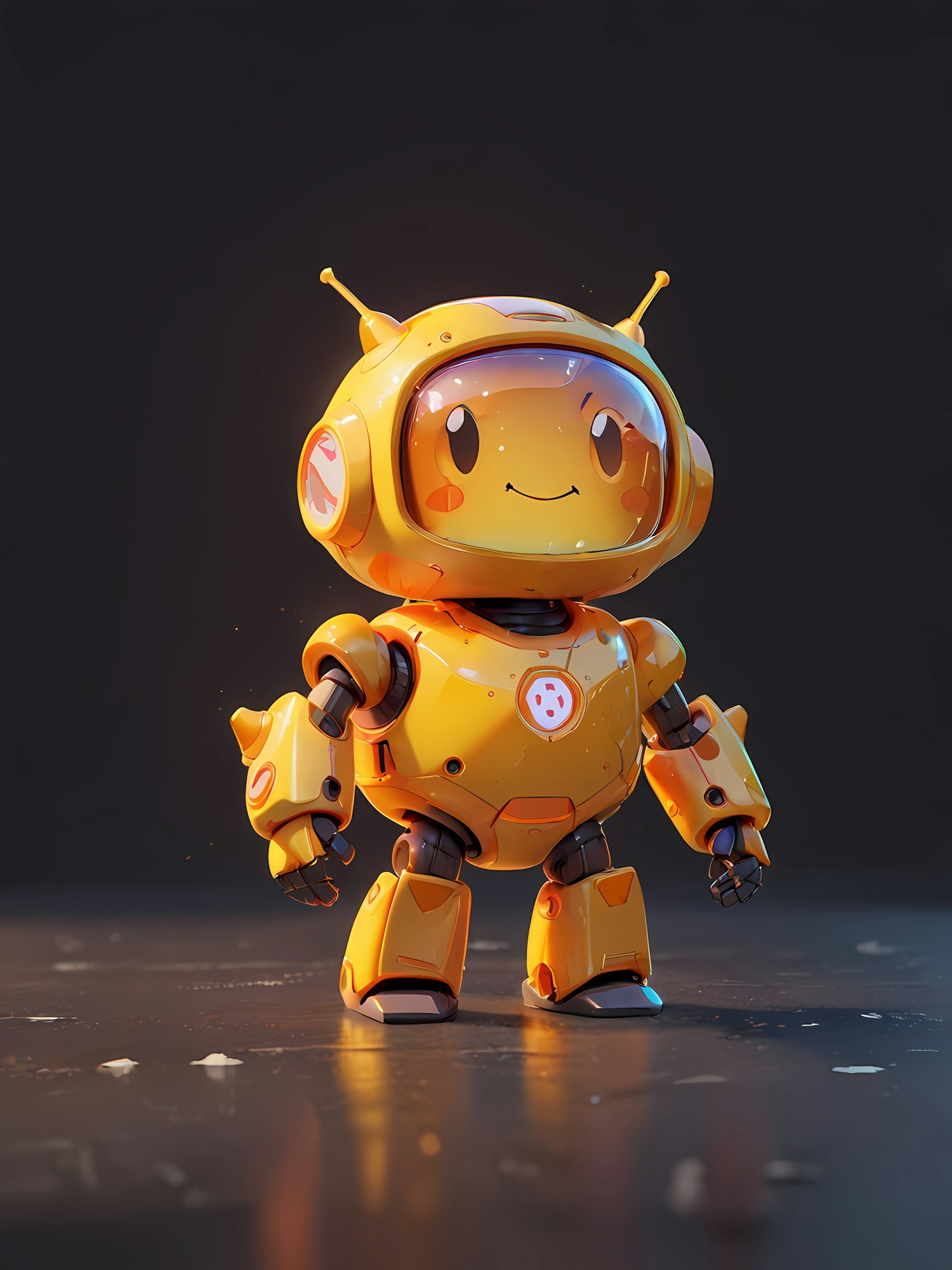 Adorable yellow robot with a cheerful face and antennae, standing on a reflective surface against a dark background.