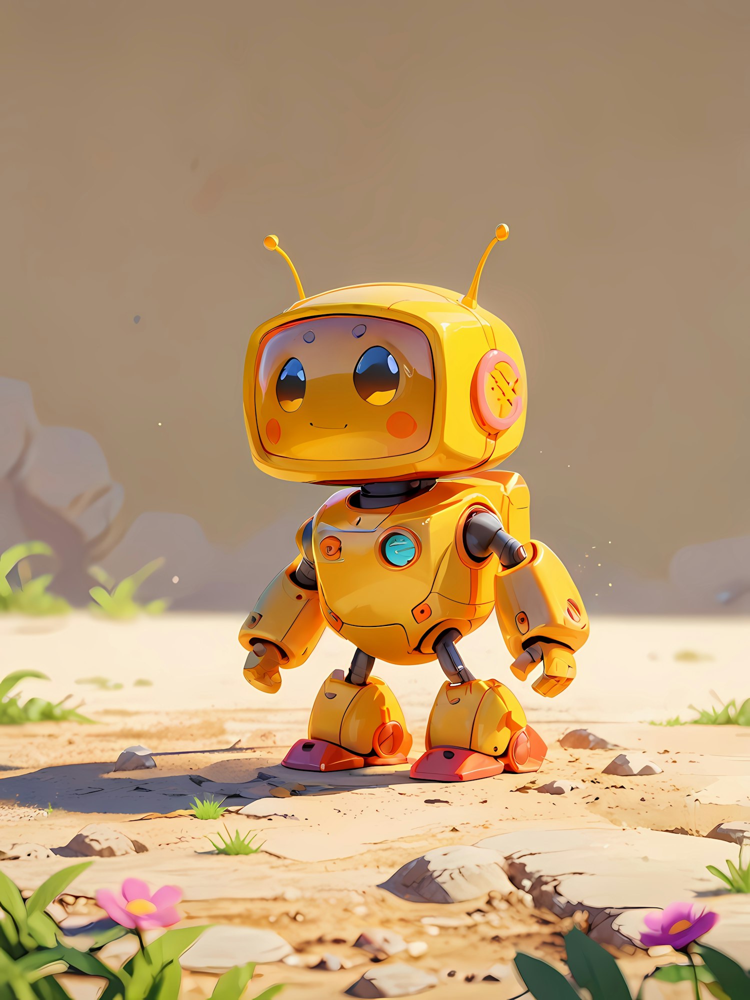 Adorable yellow robot with a cheerful face stands on sandy ground, surrounded by grass and a pink flower under a sunny sky.