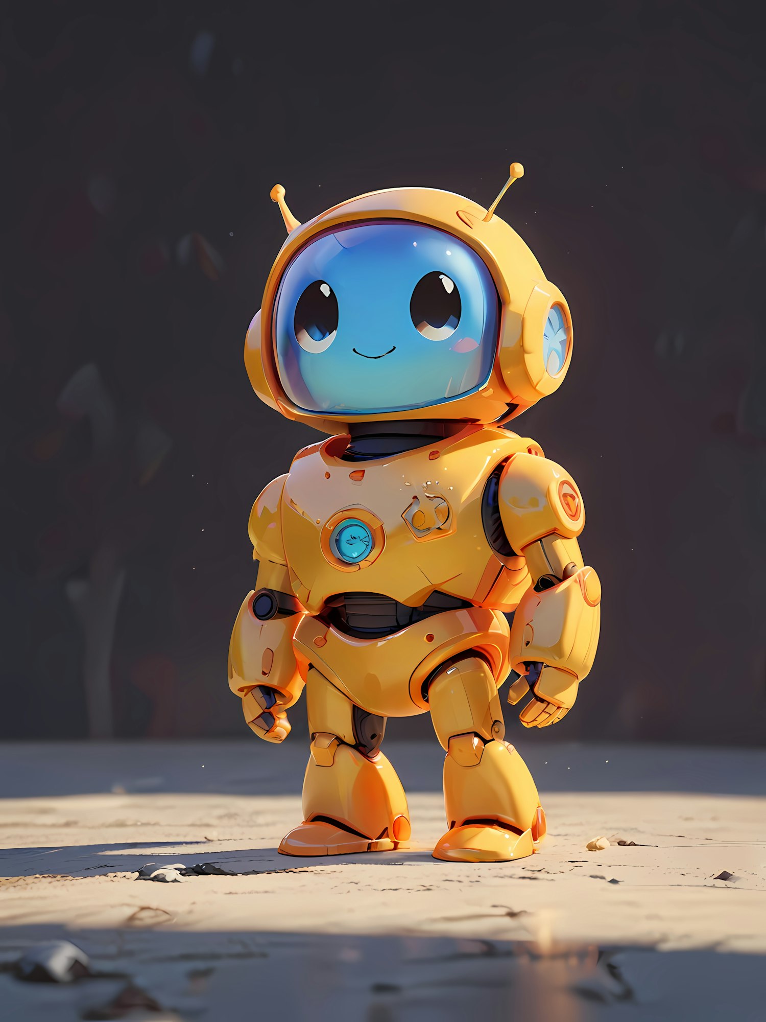 Adorable yellow robot with a glowing blue chest emblem and a cheerful digital face, standing on a cracked, sunlit surface.