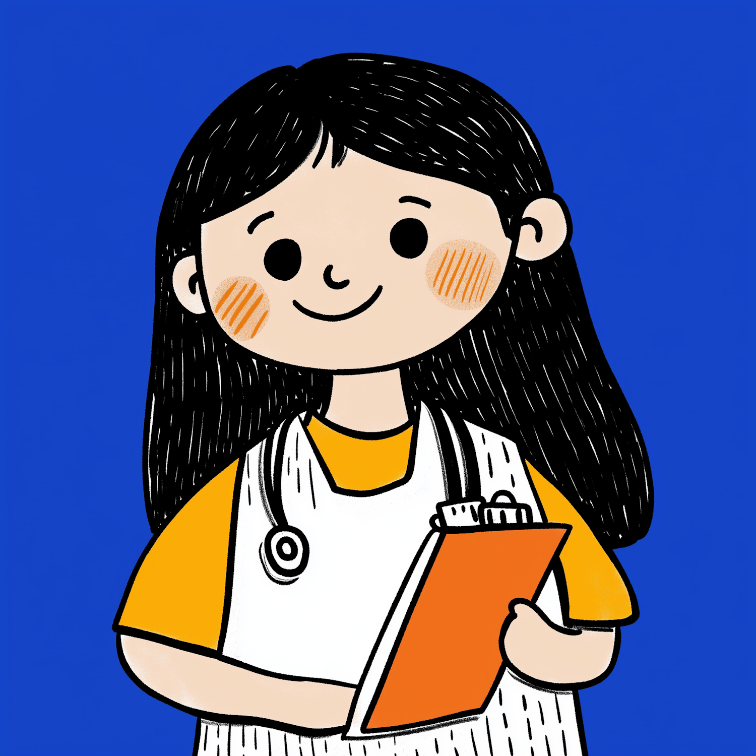 Charming cartoon of a young girl with a stethoscope and clipboard, set against a vibrant blue background.