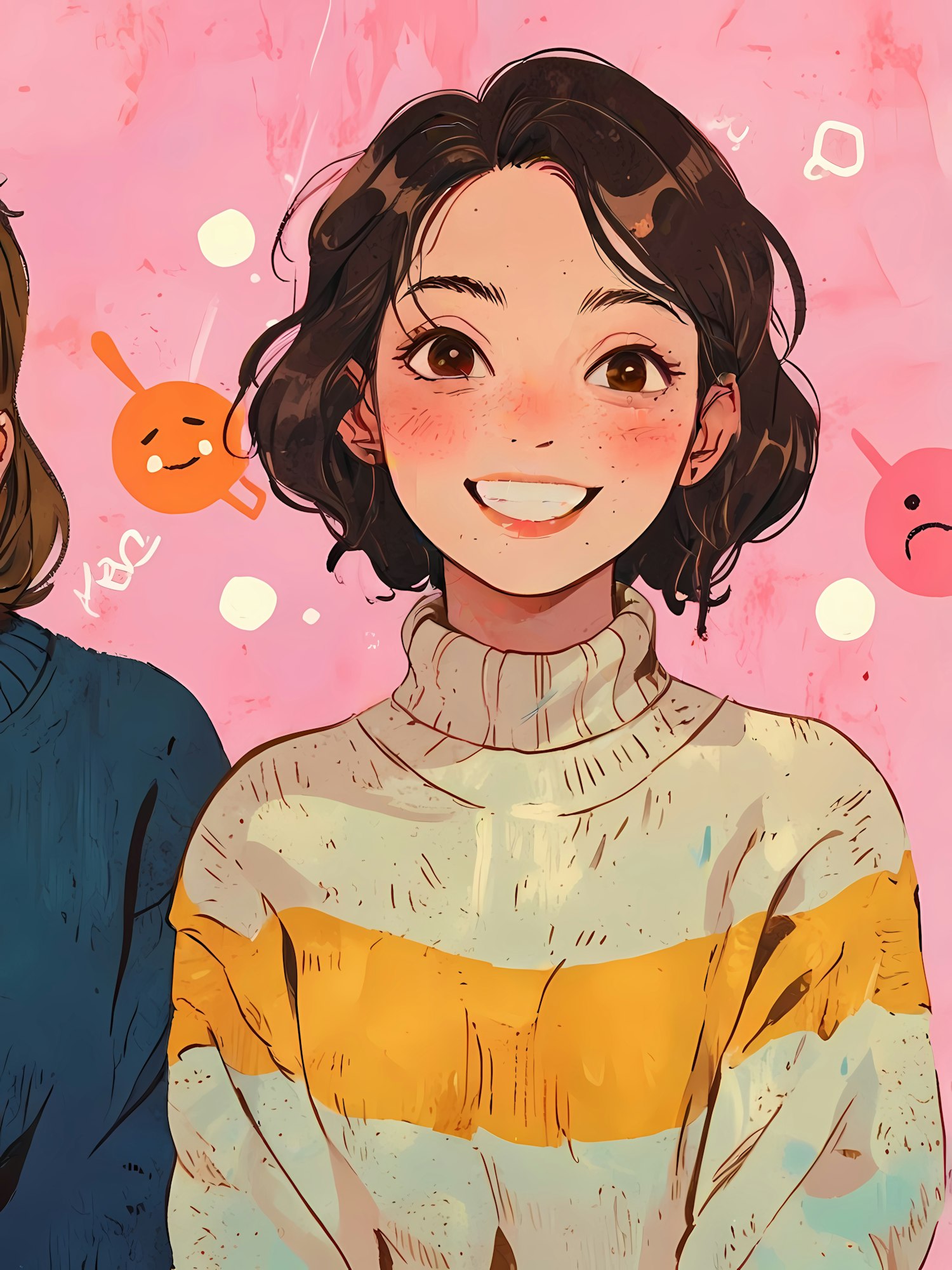 Cheerful illustration of a smiling woman with short black hair, wearing a striped sweater against a playful pink background.