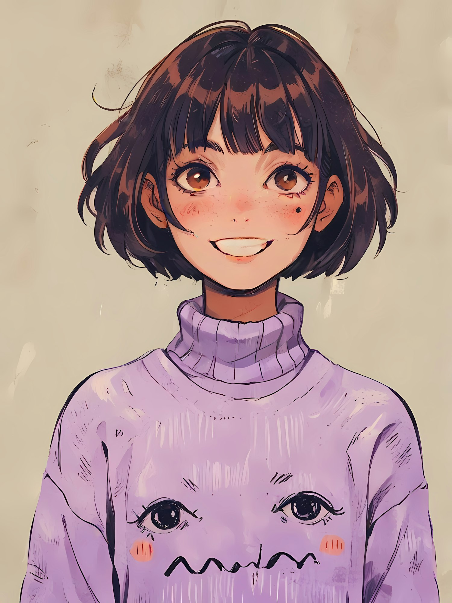 Anime-style illustration of a smiling girl with short brown hair and a lavender sweater with a face design.