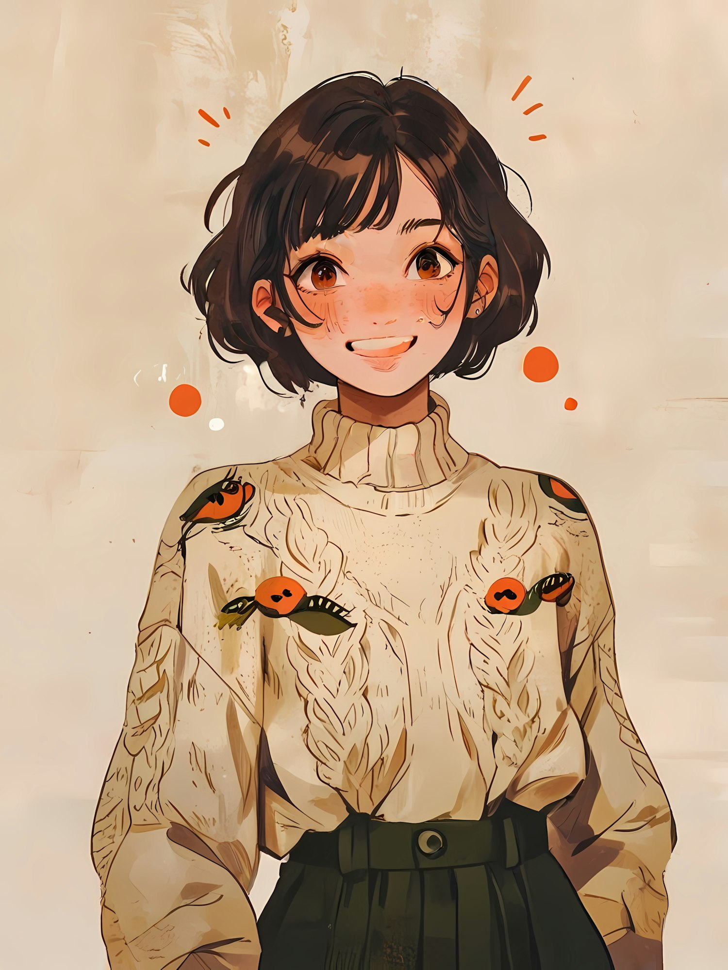Illustration of a smiling woman in a cream sweater with pumpkin embroidery, paired with a green skirt, exuding autumn vibes.
