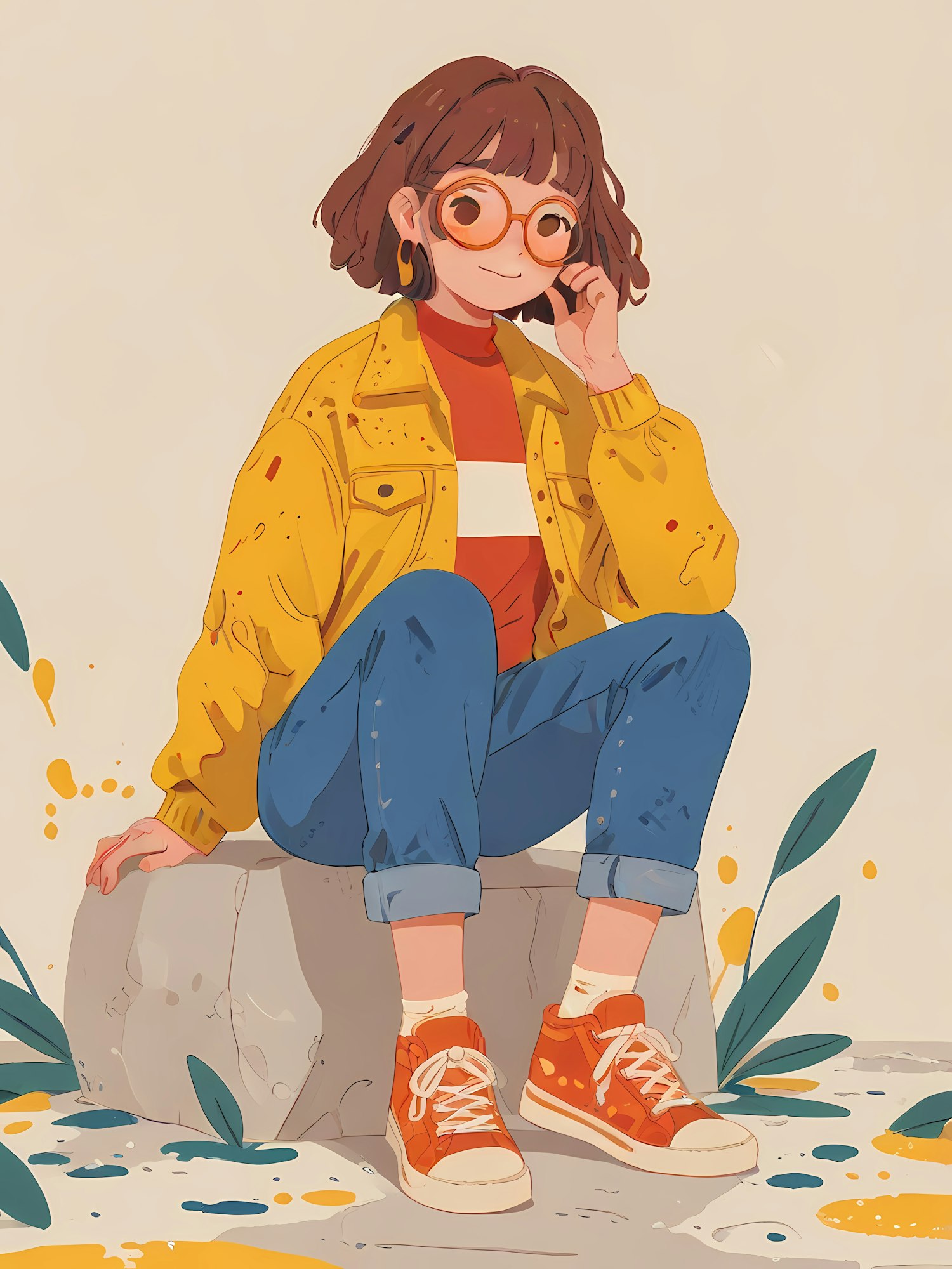 Stylish young woman in a yellow jacket and orange sneakers, sitting on a stone block with a cheerful expression. Vibrant and artistic.