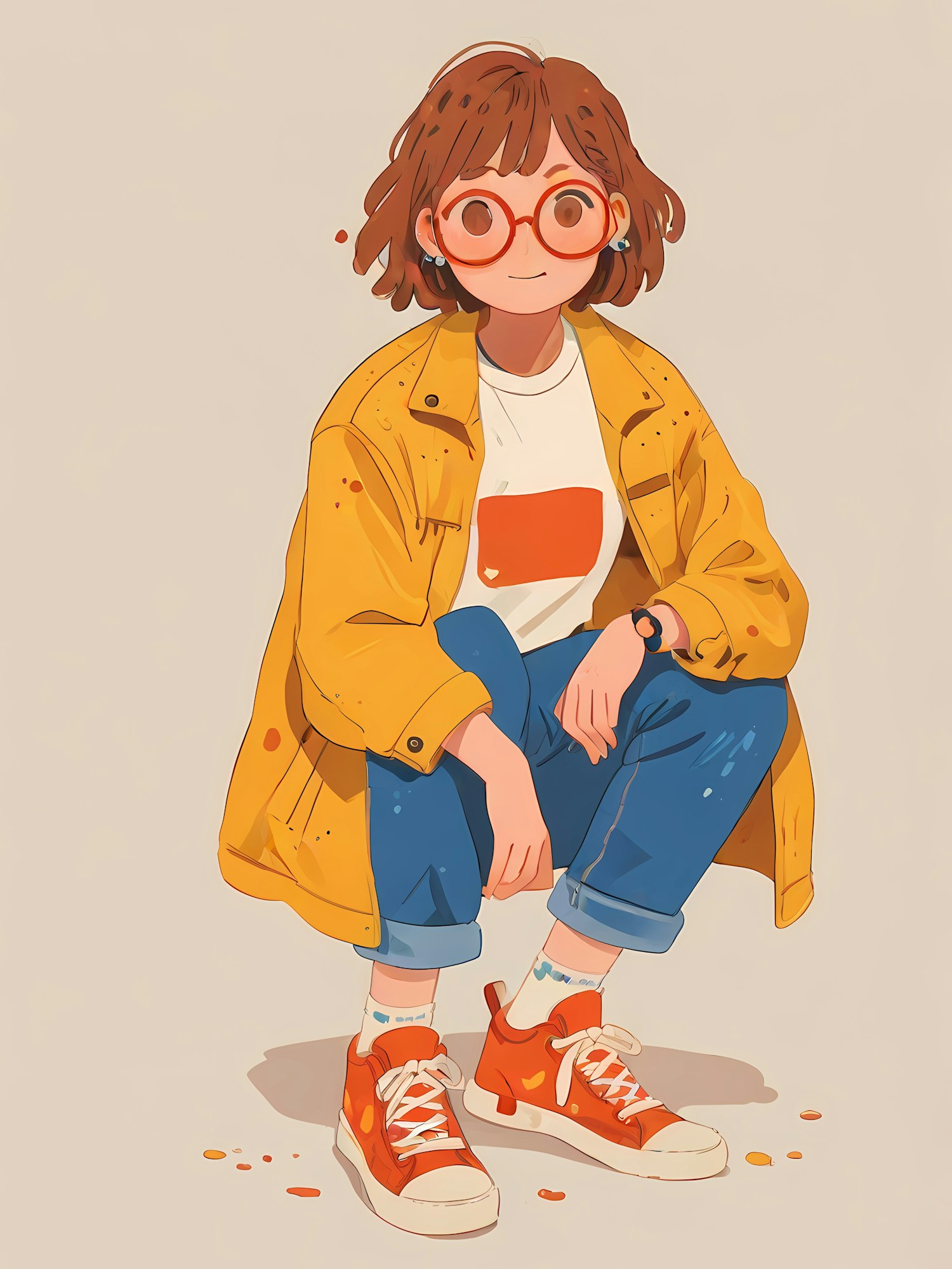 Cartoon character in a yellow jacket, red glasses, and orange sneakers, exuding youthful energy and style.