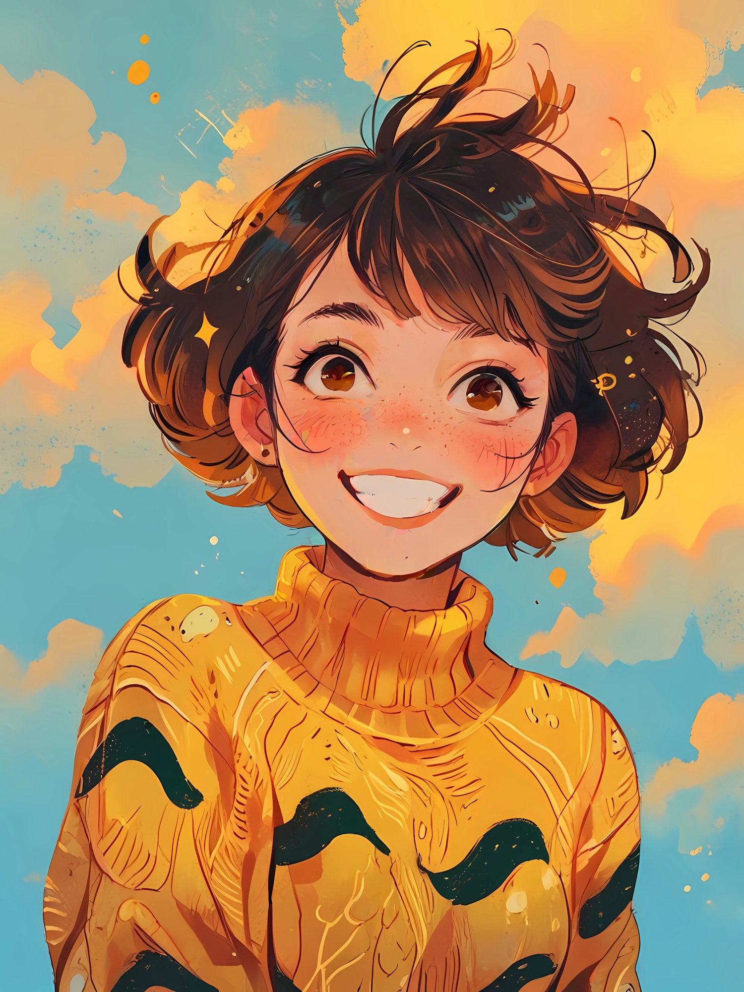 Joyful illustration of a young woman with wavy brown hair, wearing a yellow sweater against a dreamy sky background.