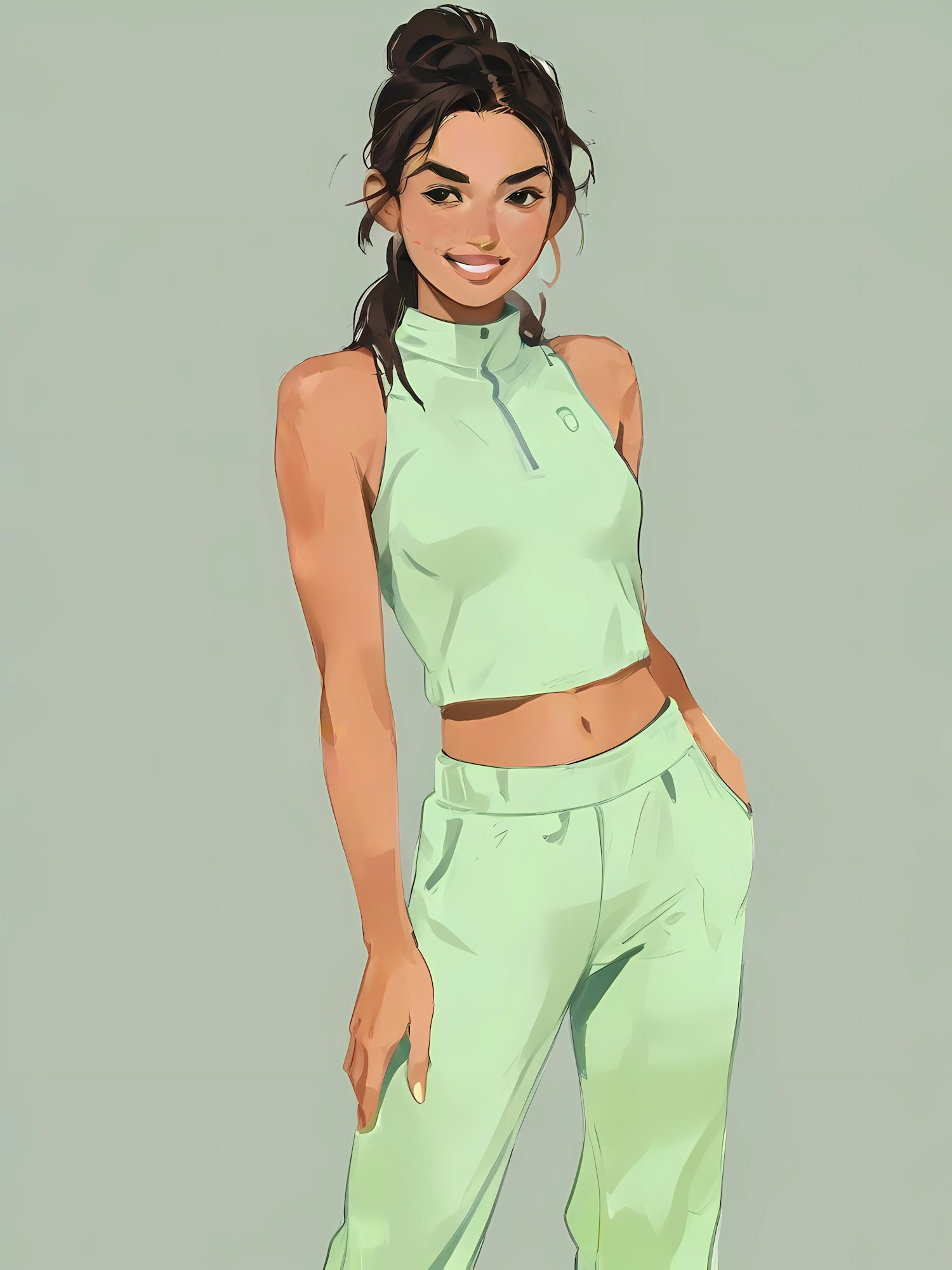 Stylish illustration of a young woman in light green sporty attire, smiling warmly, with a minimalist muted background.