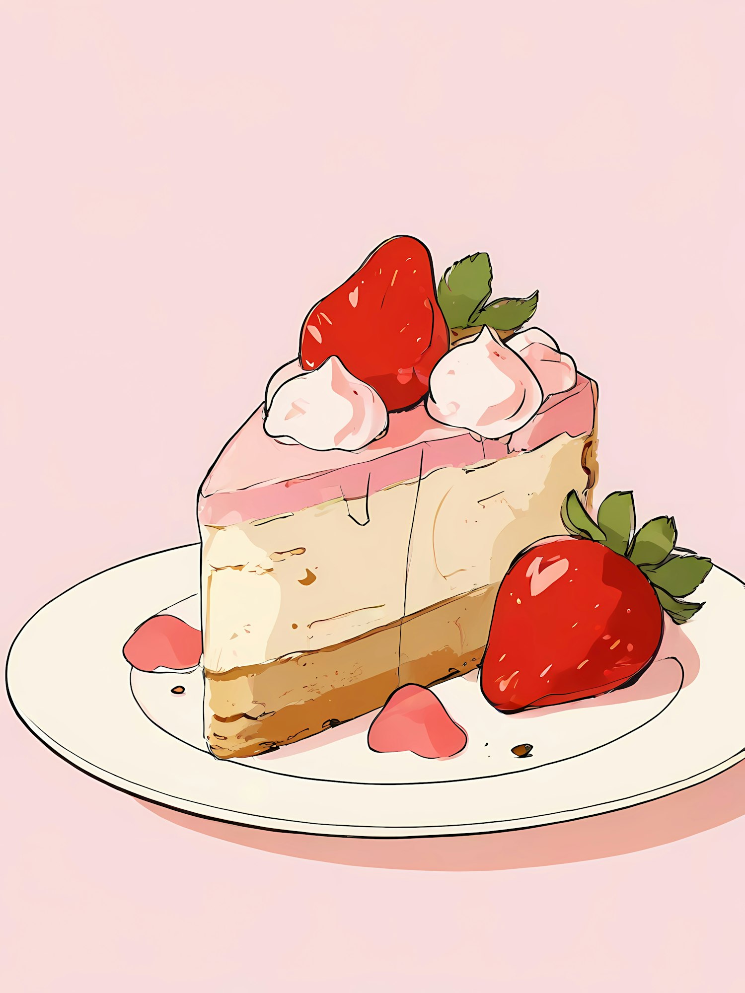 A slice of cheesecake with pink glaze, strawberries, whipped cream, and heart-shaped decorations on a white plate.