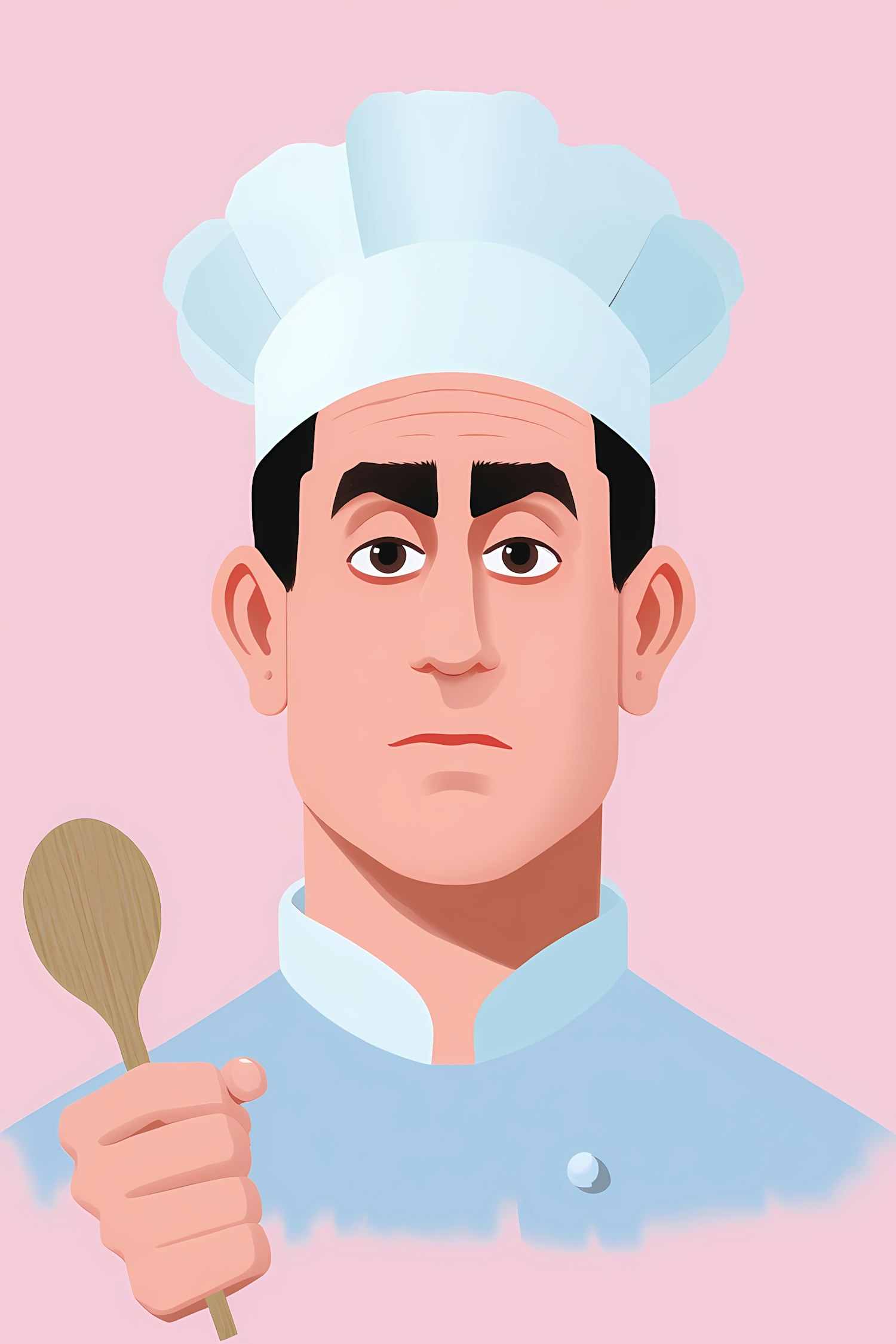 Illustration of a chef in a white hat holding a wooden spoon against a pastel pink background, showcasing a clean and minimalistic style.