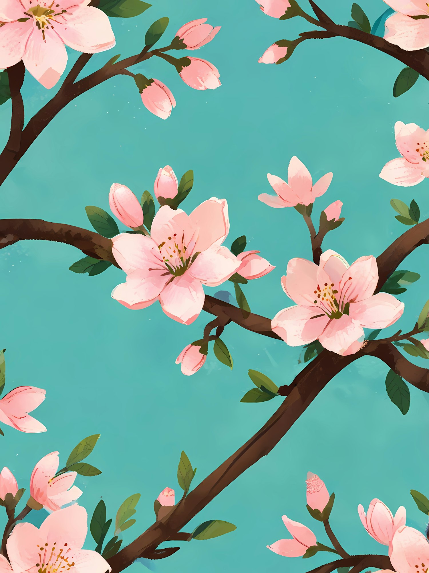 Beautiful cherry blossom illustration with pink flowers and green leaves on a turquoise background, evoking a serene springtime vibe.