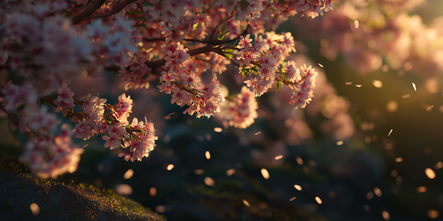A serene close-up of cherry blossoms in warm sunlight, with petals gently falling and a blurred background enhancing the scene's depth.
