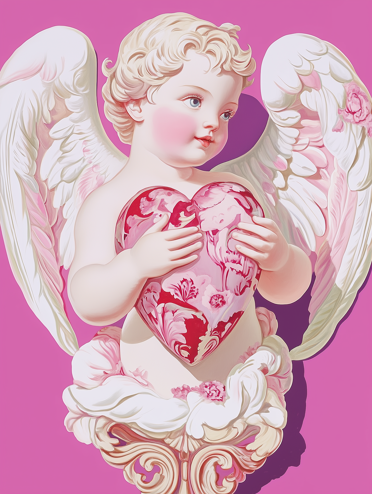A cherubic angel cupid with golden curls and white wings holds a floral heart against a vibrant pink background, exuding charm and elegance.