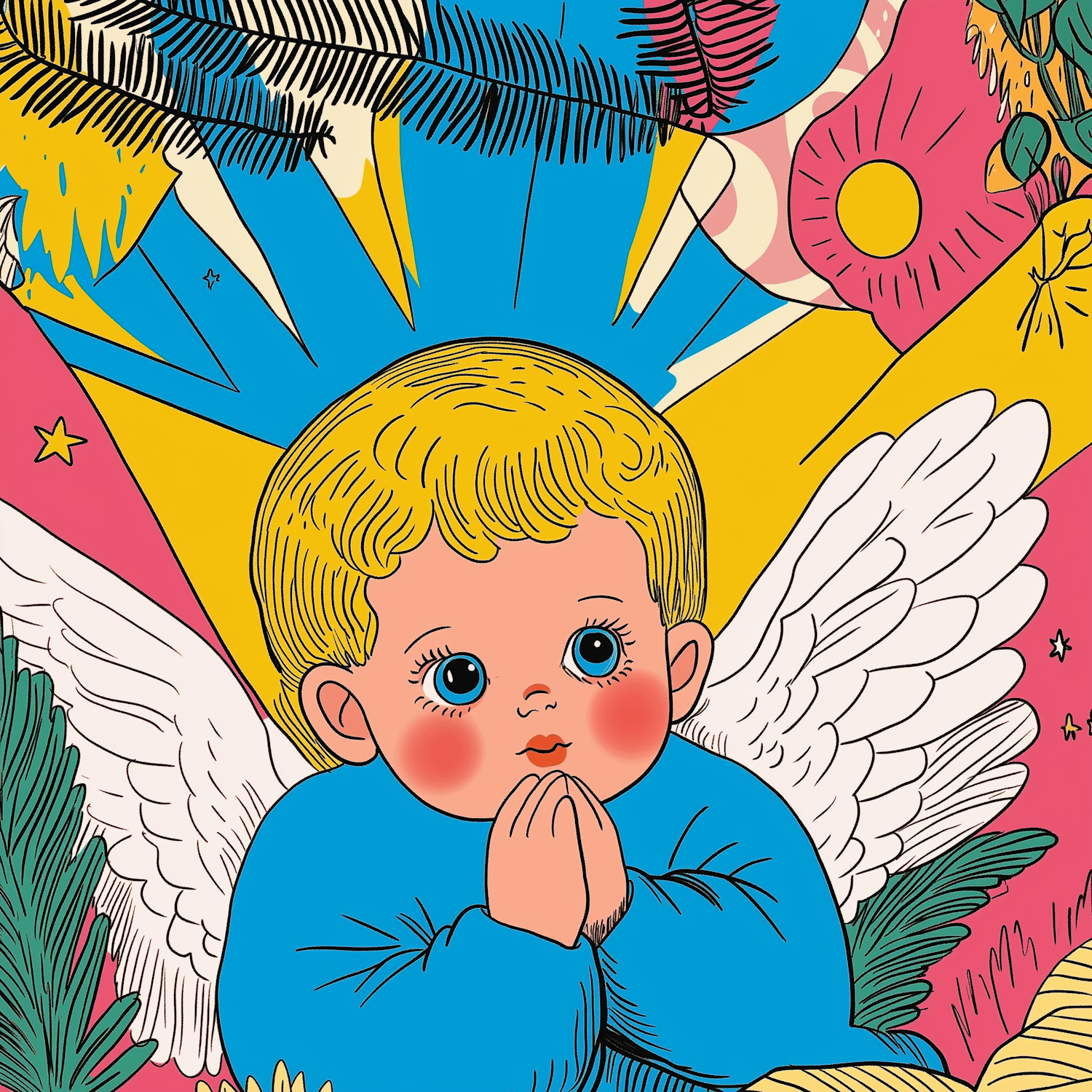 Whimsical illustration of a cherubic child angel with blonde hair, white wings, and a vibrant celestial background.