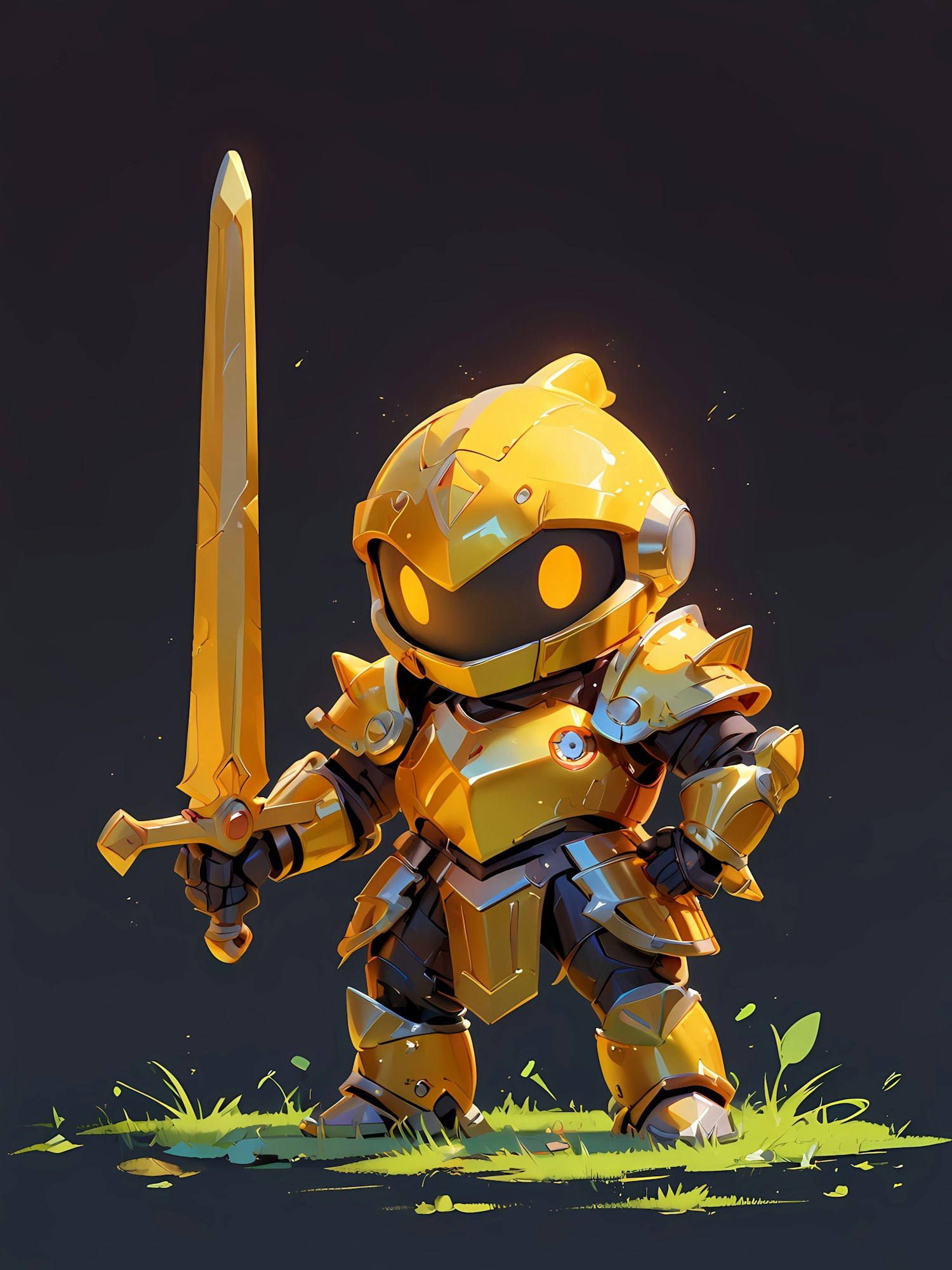 Adorable chibi knight in golden armor holding a sword, glowing eyes, and standing on grass with a dark background.