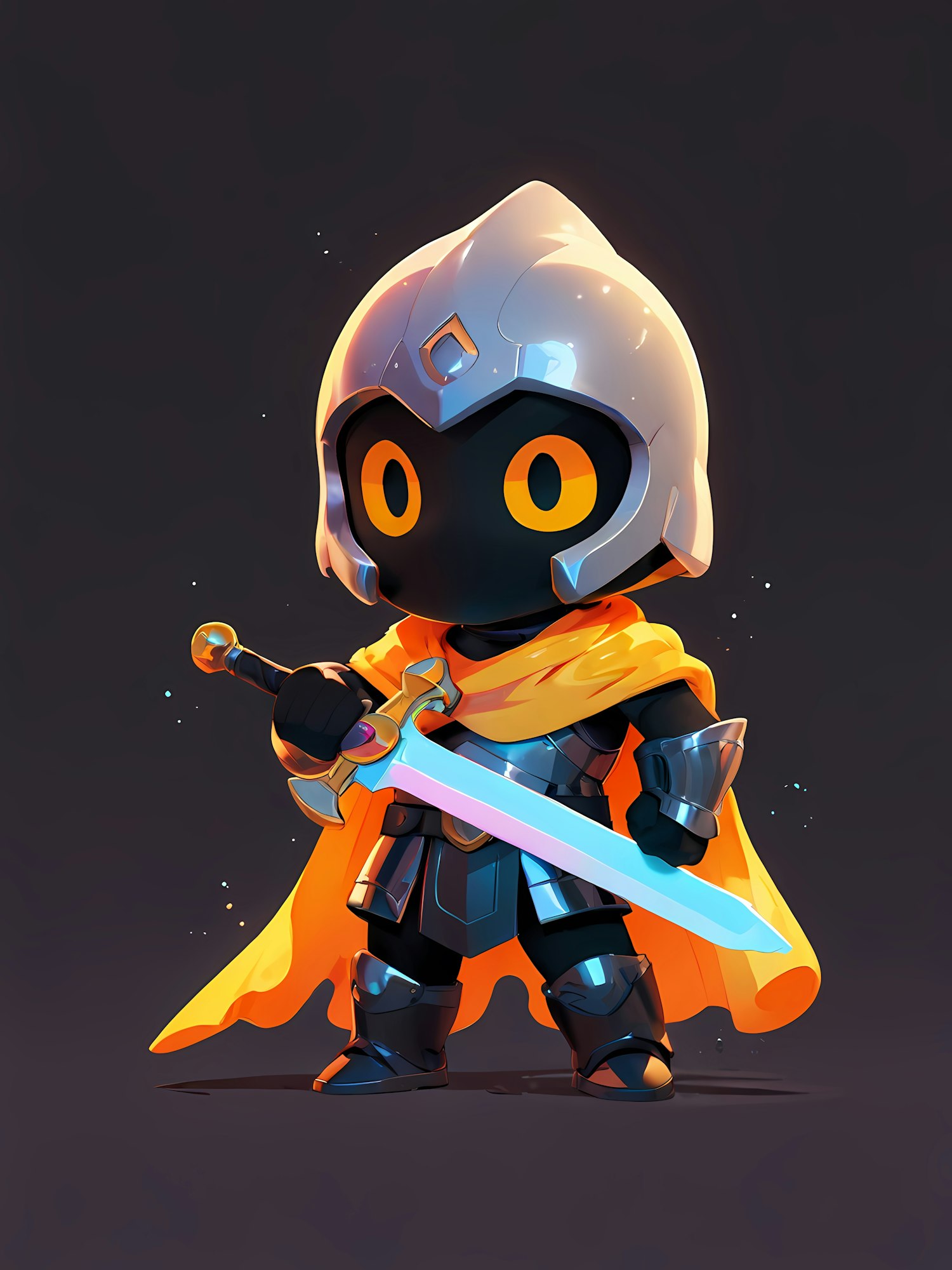 Adorable chibi knight in silver armor with glowing yellow eyes, an orange cape, and a magical multicolored sword. Perfect fantasy vibes!