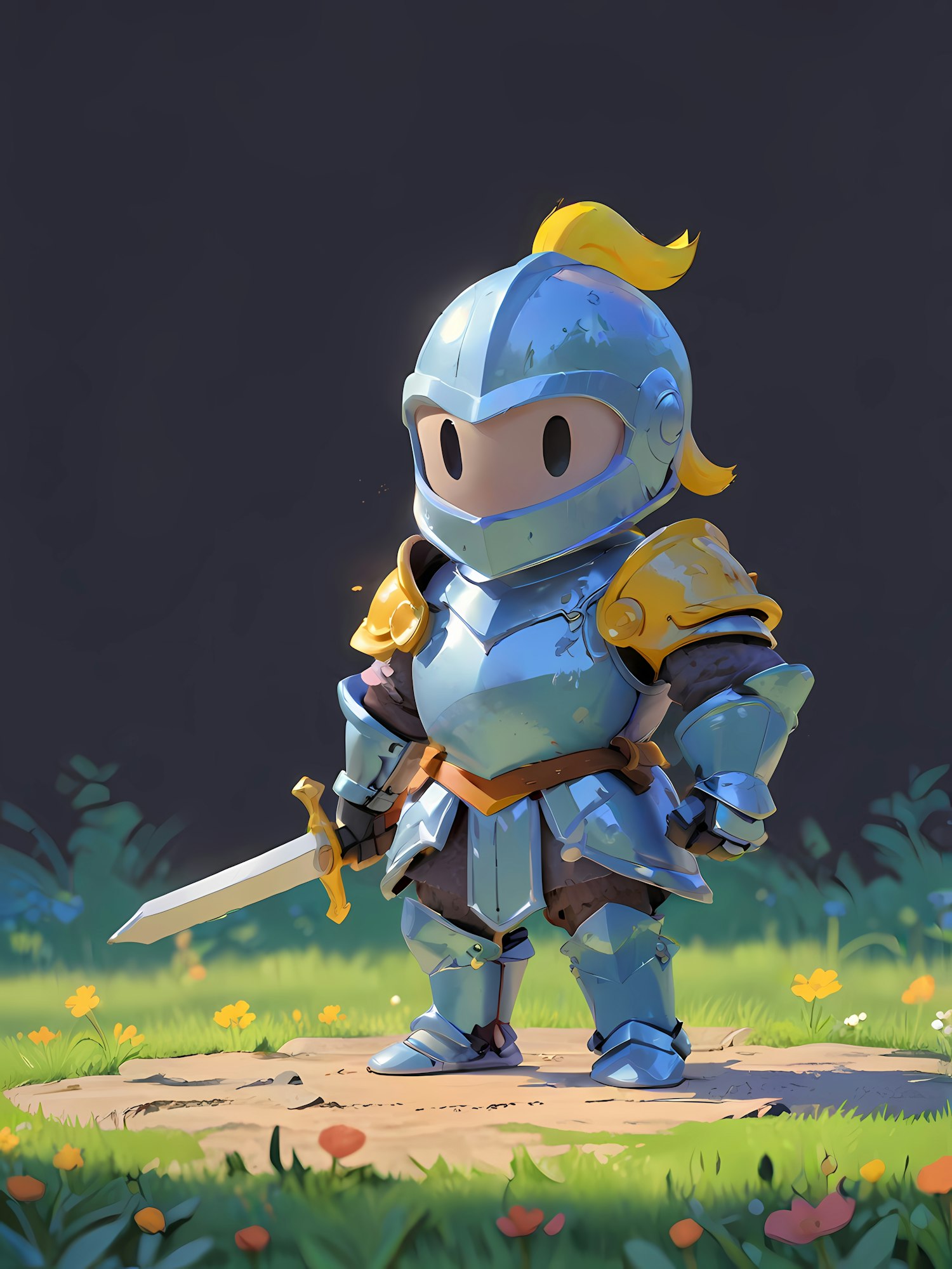 Adorable chibi knight in shiny blue and gold armor, holding a sword in a vibrant field with flowers. Perfect for fantasy or gaming themes.