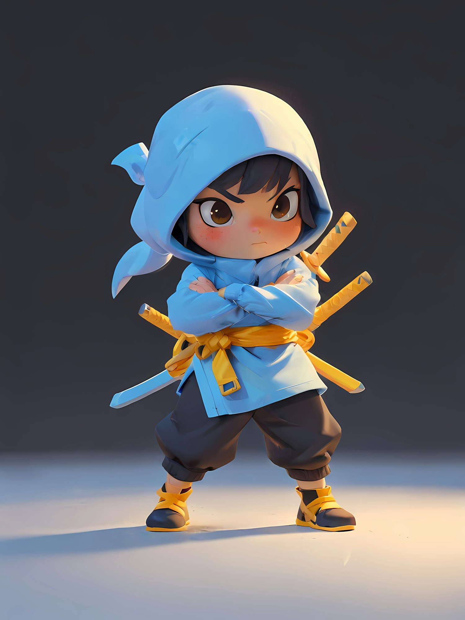 Adorable chibi ninja in a blue hood and yellow belt, armed with swords, striking a confident pose in a dark background.