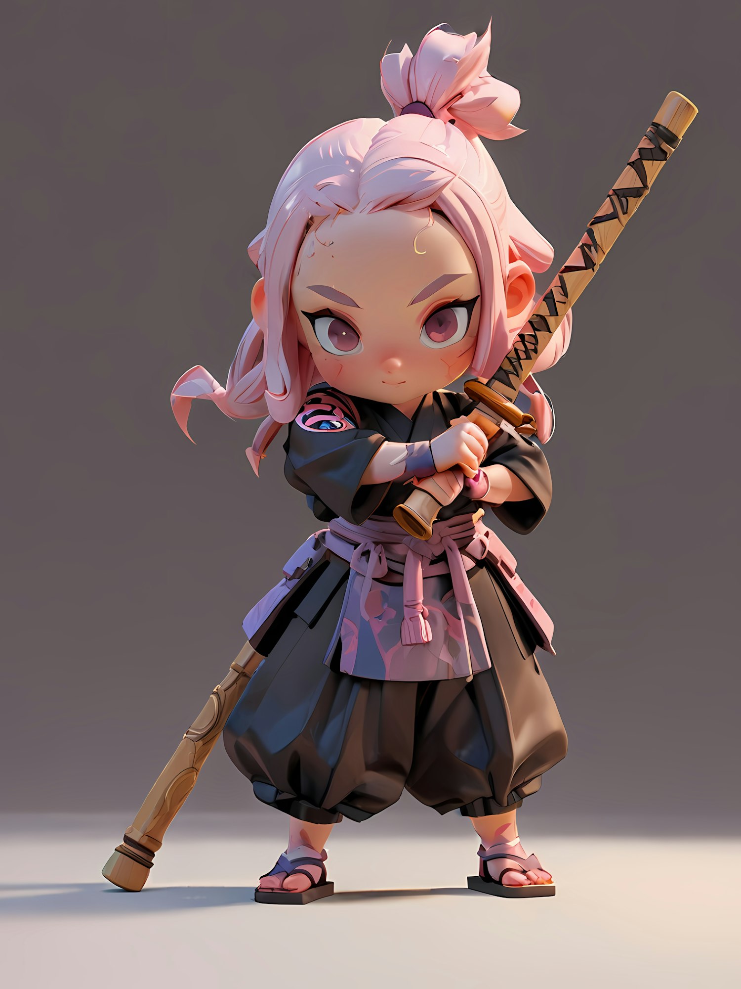 Chibi-style 3D character with pink hair, samurai outfit, and katana in a confident pose. Perfect for fans of stylized art and anime aesthetics.