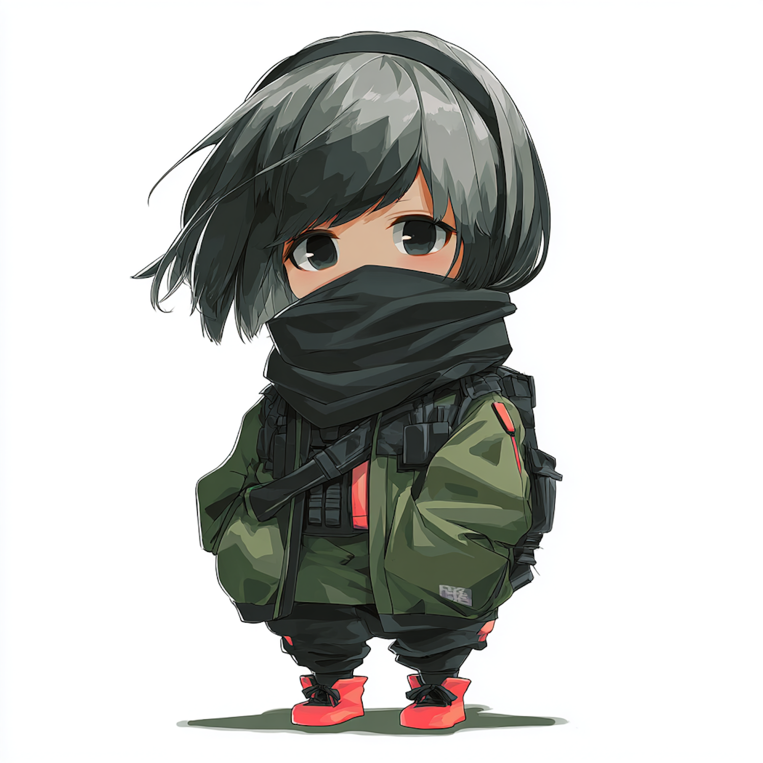 Chibi character in a green tactical outfit with a black scarf and red shoes, featuring a clean and minimalistic design.