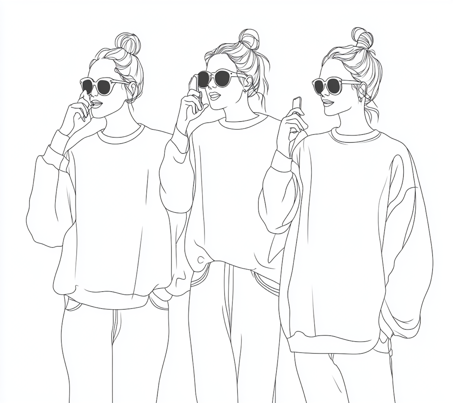 Minimalist line art of a woman in sunglasses and a sweatshirt, holding a phone. Three identical figures in different poses.