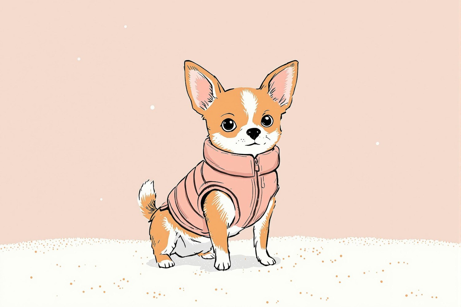 Adorable Chihuahua in a pink puffer jacket sitting on snow with a soft beige background and falling snowflakes. Perfect winter vibes!