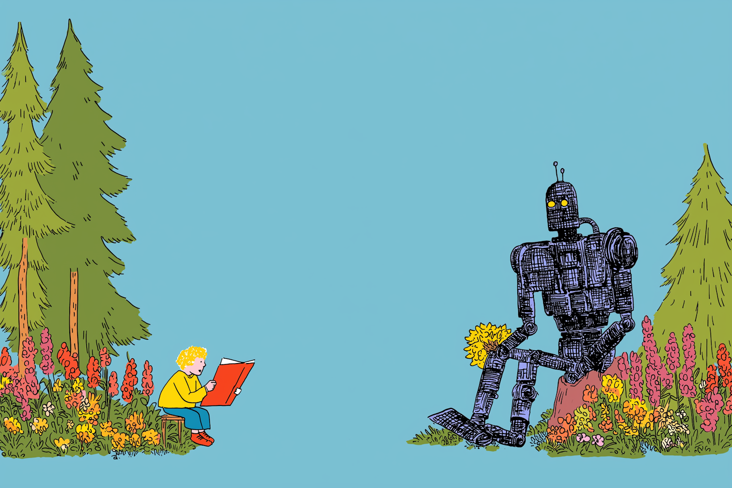 A child reads a book in a vibrant garden while a robot sits nearby, creating a whimsical and serene outdoor scene.