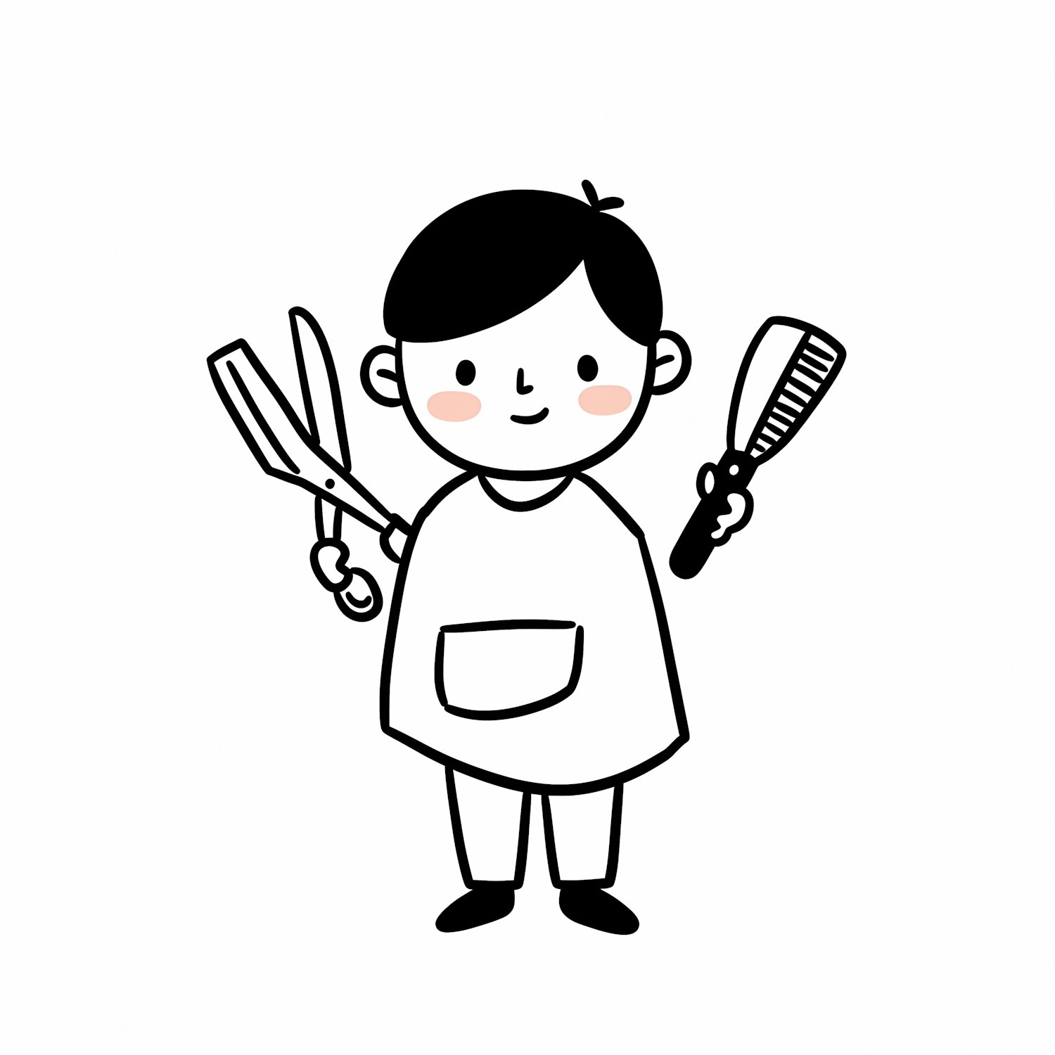 Cute black-and-white illustration of a child holding scissors and a comb, wearing a smock with a pocket, on a plain white background.