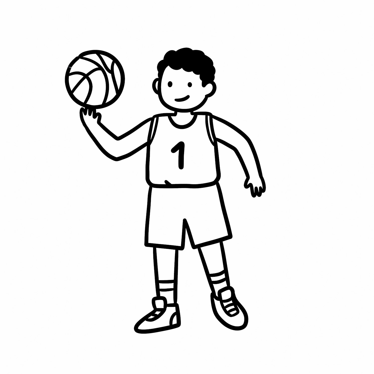 A cheerful cartoon illustration of a child in a basketball uniform holding a basketball, drawn in a simple black-and-white style.