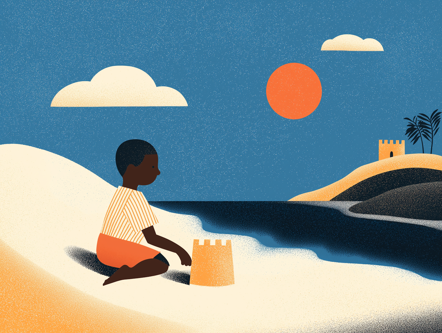 A vibrant illustration of a child building a sandcastle on a sunny beach, with a scenic ocean, hills, and a bright orange sun in the background.