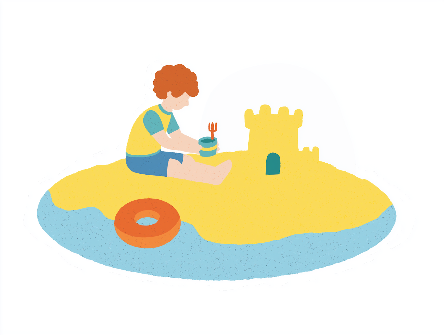 Illustration of a child building a sandcastle on a sunny beach, surrounded by sand, water, and a red inflatable ring.