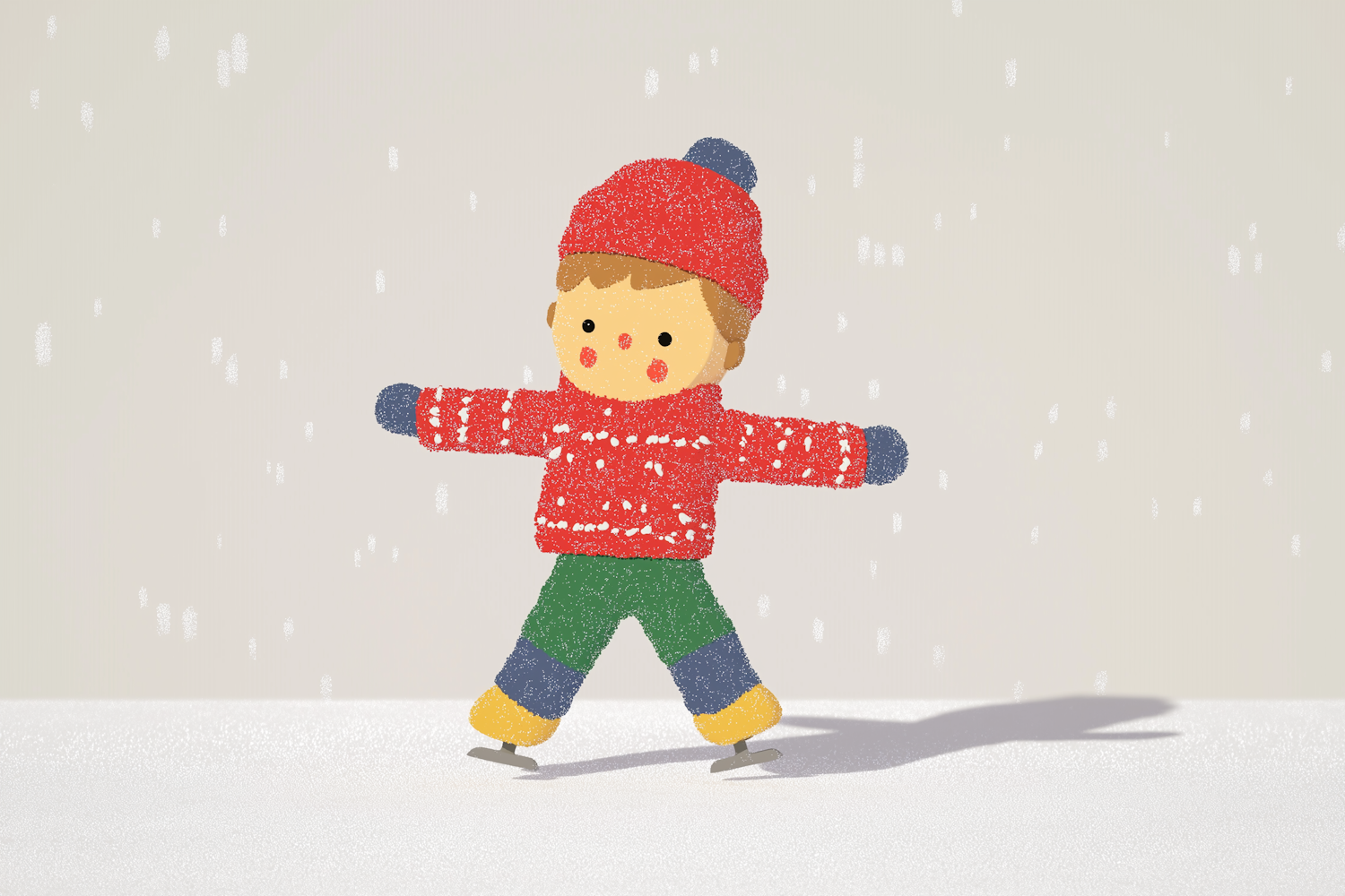 Illustration of a child ice skating in winter attire with a red hat and sweater, set against a snowy background.