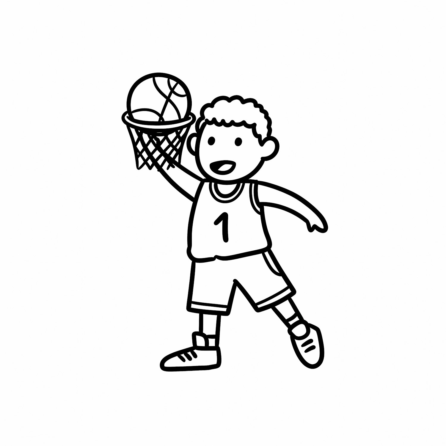 A playful black-and-white cartoon of a child scoring a basketball, wearing a jersey with the number '1'.