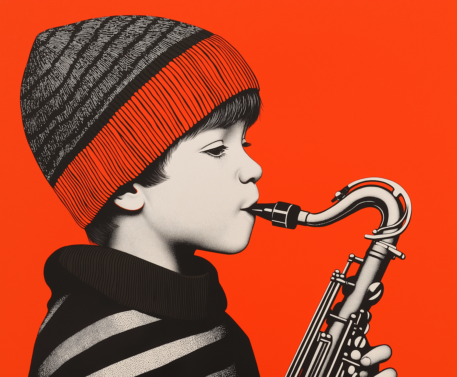 Child in striped beanie plays saxophone against a vibrant orange background, blending monochrome and color in a striking illustration.