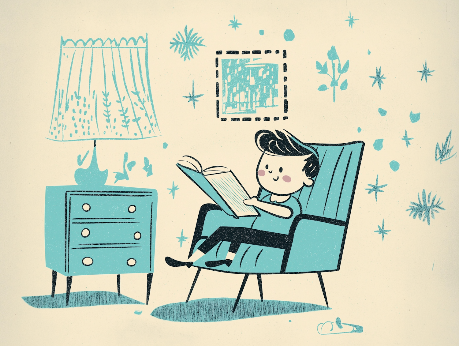 Charming retro illustration of a boy reading in a cozy room with teal and cream decor, featuring stars and plants.
