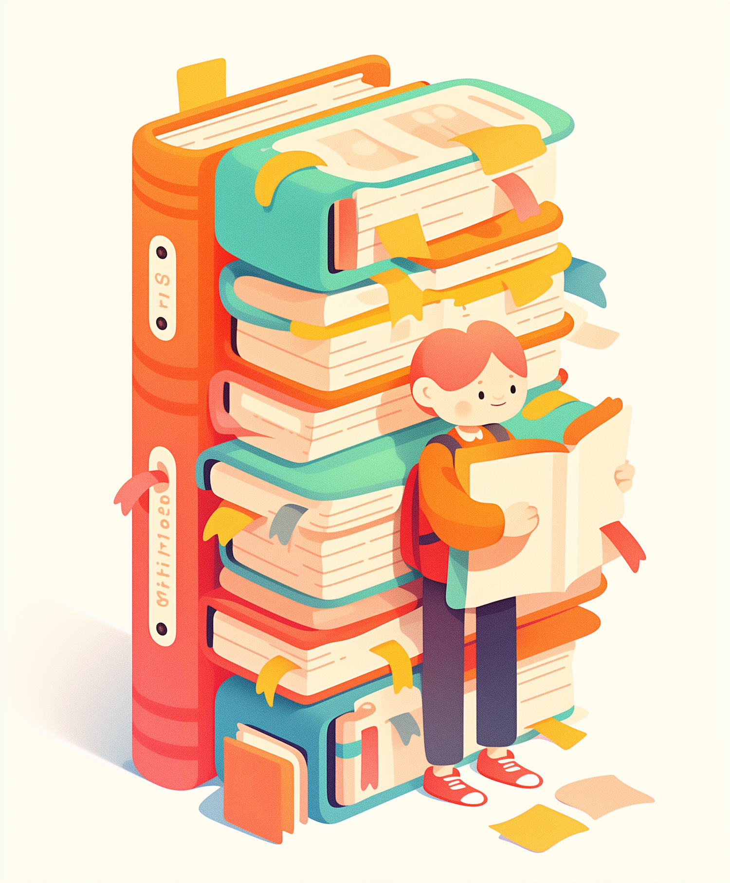 A child with red hair reads a book beside a stack of oversized colorful books, symbolizing adventure and discovery in reading.