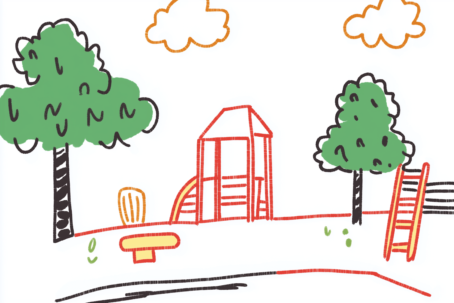 Colorful playground illustration with trees, slide, and clouds, creating a whimsical and inviting scene for children.