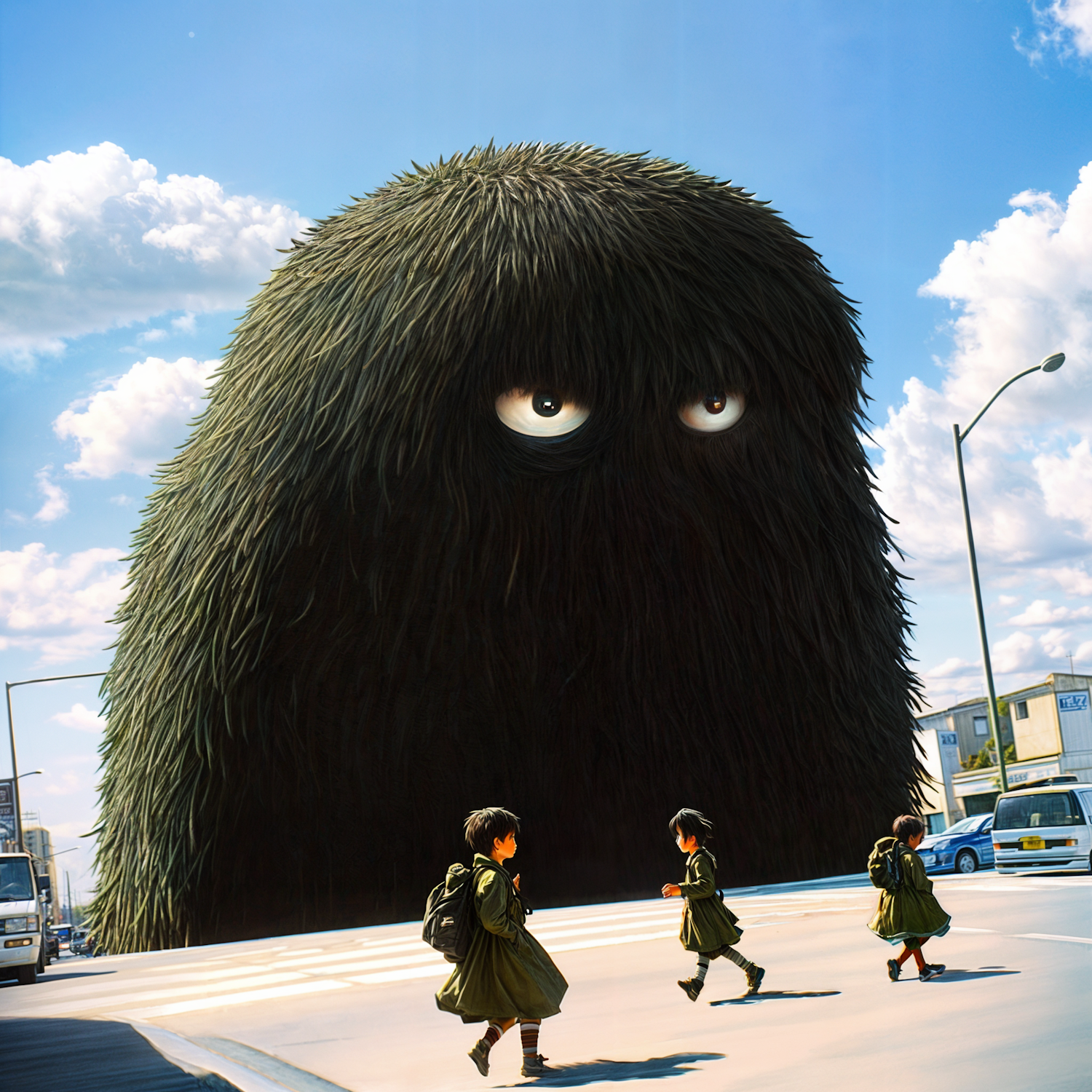 Three children cross a sunny street, unaware of a towering, furry creature with big eyes looming behind them in a whimsical urban scene.