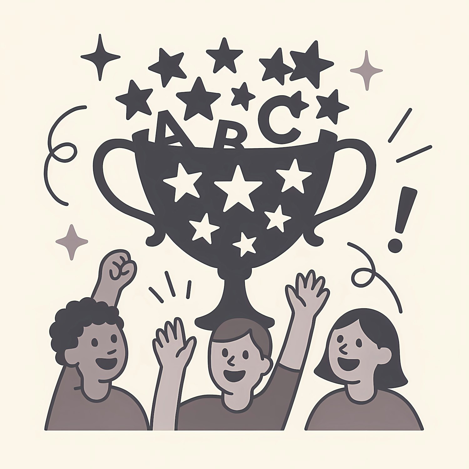 Fun illustration of kids celebrating with a starry trophy, symbolizing achievement and teamwork in a playful, cartoonish style.